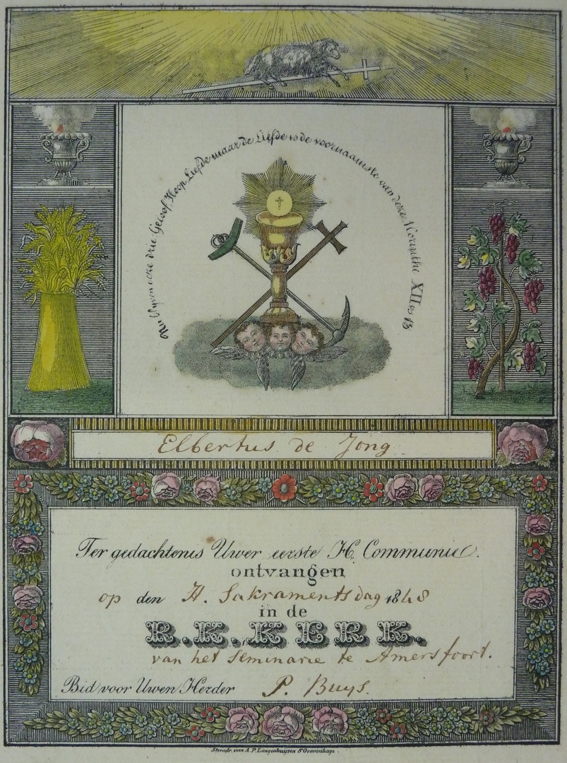 H. Communie van Elbertus de Jong, R.K. kerk (Cleresie) seminarie Amersfoort 1848, ingekleurd