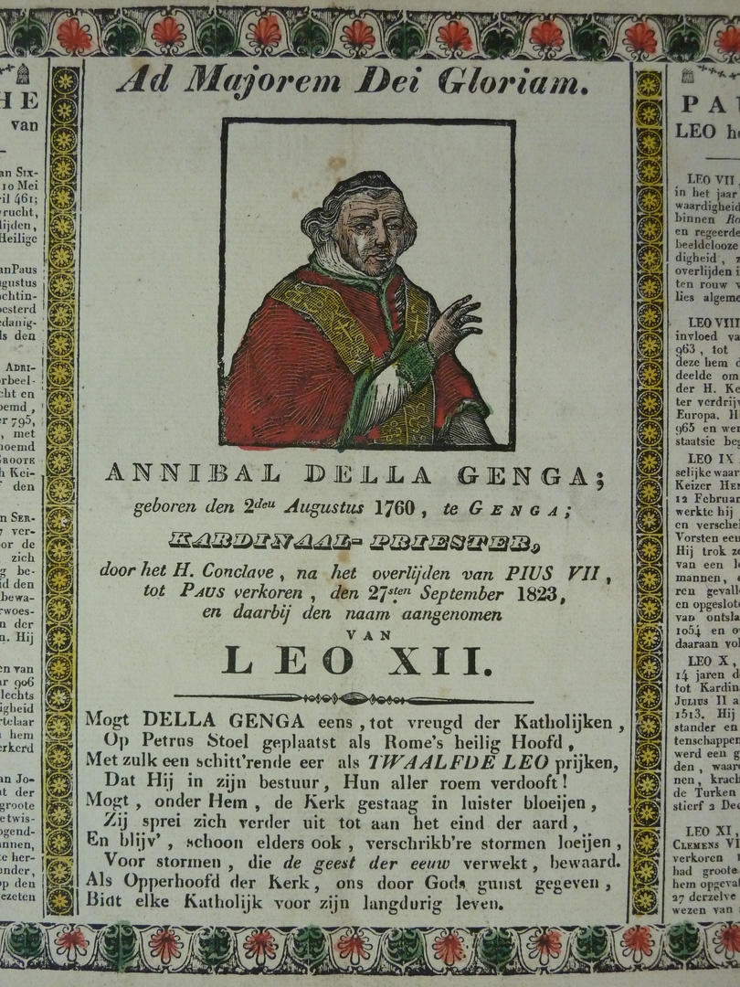 Gedachtenisprent bij de pauskeuze van Leo XII (1760-1829) en alle voorgangers met de naam Leo, ingekleurd