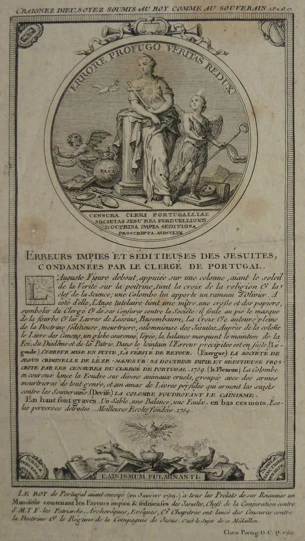 Erreurs impies et séditieuses des Jésuites, condamnées par le clegé de Portugal, met medaillon met allegorie met "Errore profugo veritas redux"