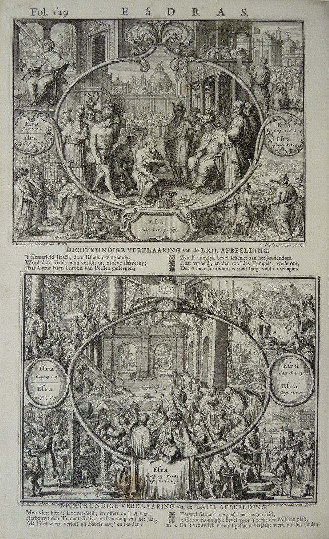 Serie 'Alle Voornaemste Historien .. Testaments': Aanvang herbouw van de tempel (Ezra 3:12)