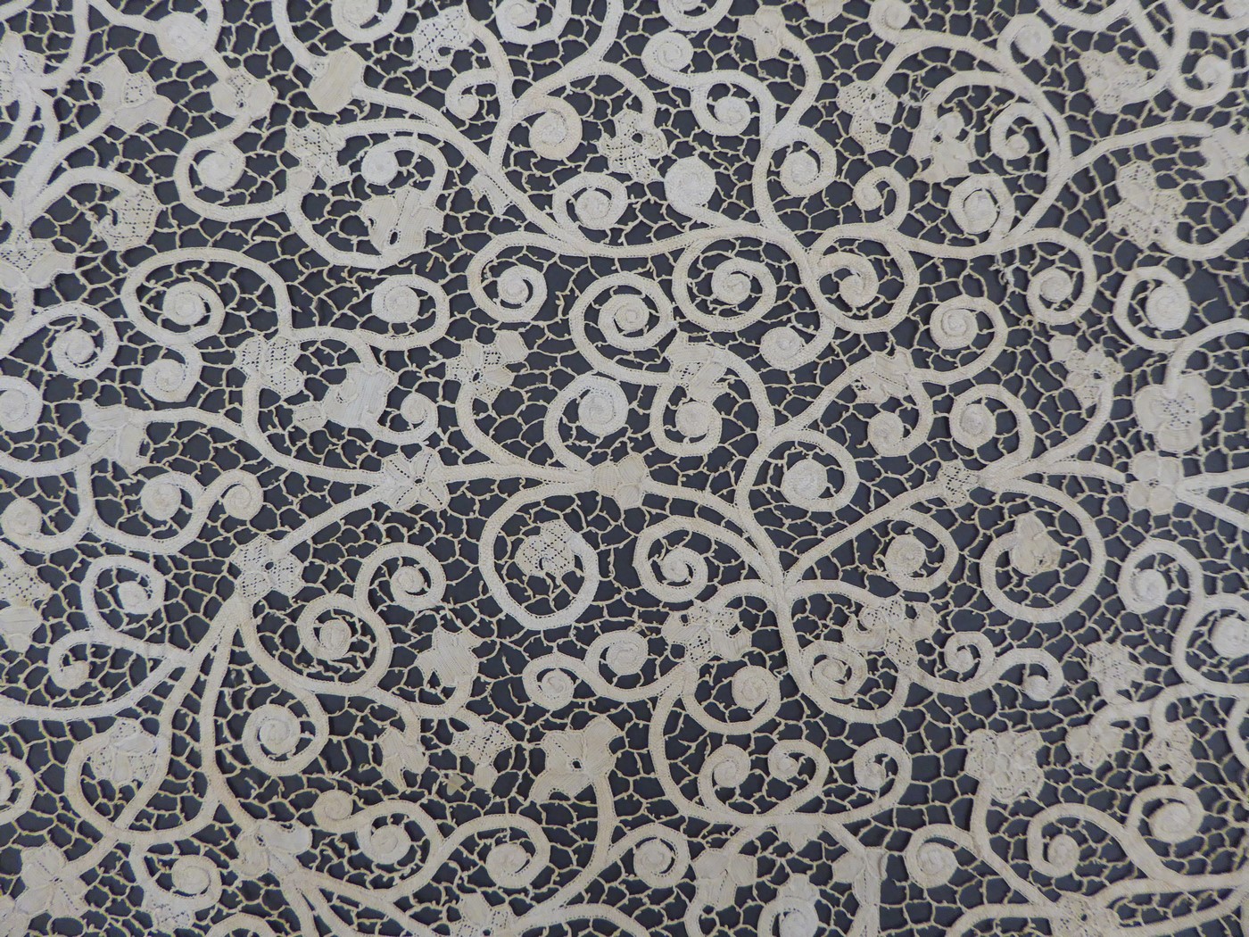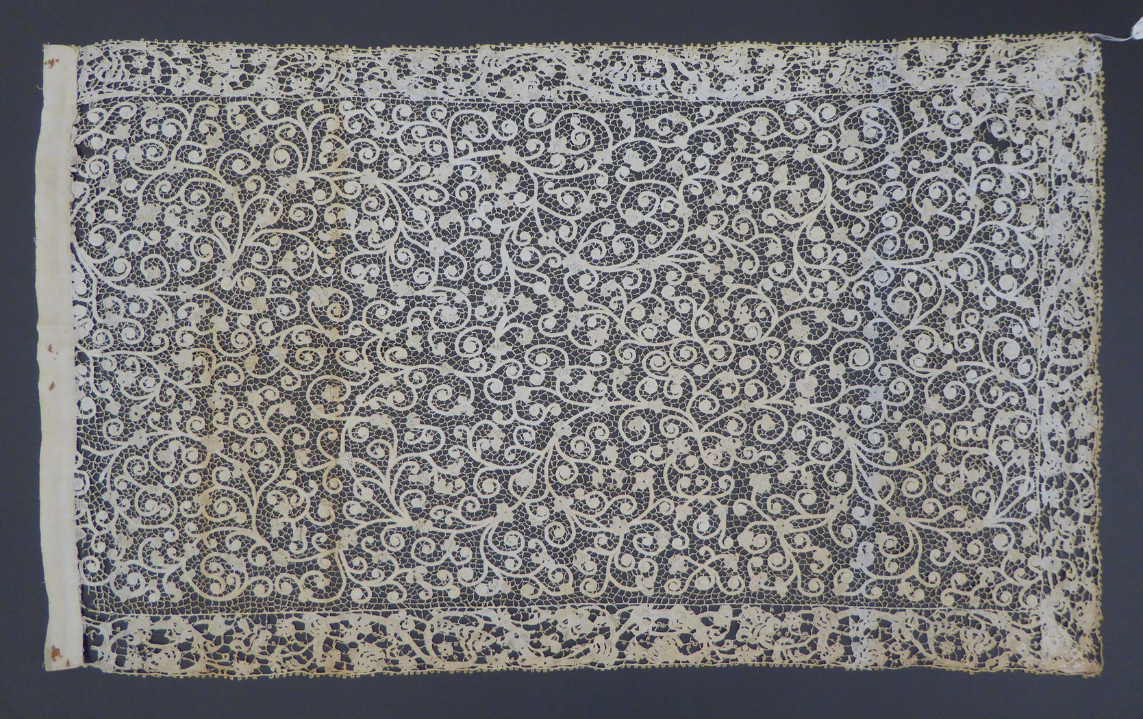 Milanese lintkant met naaldkant vullingen, spijlen met picots, afgezet met Venise plat