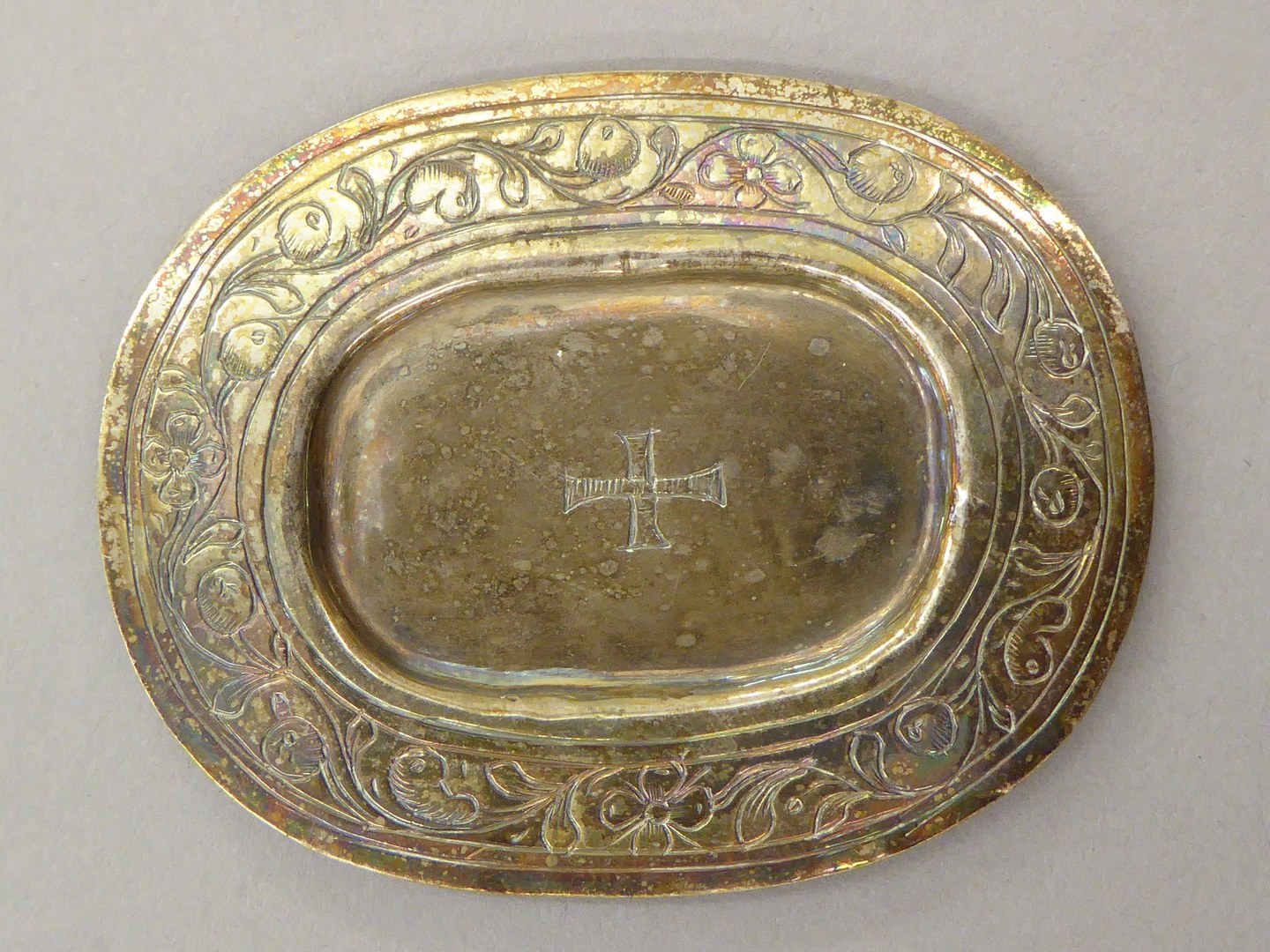 Speelgoedlavaboblad, ovaal, met kruisje, rand versierd met bloemen en oranje-appeltjes