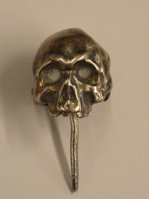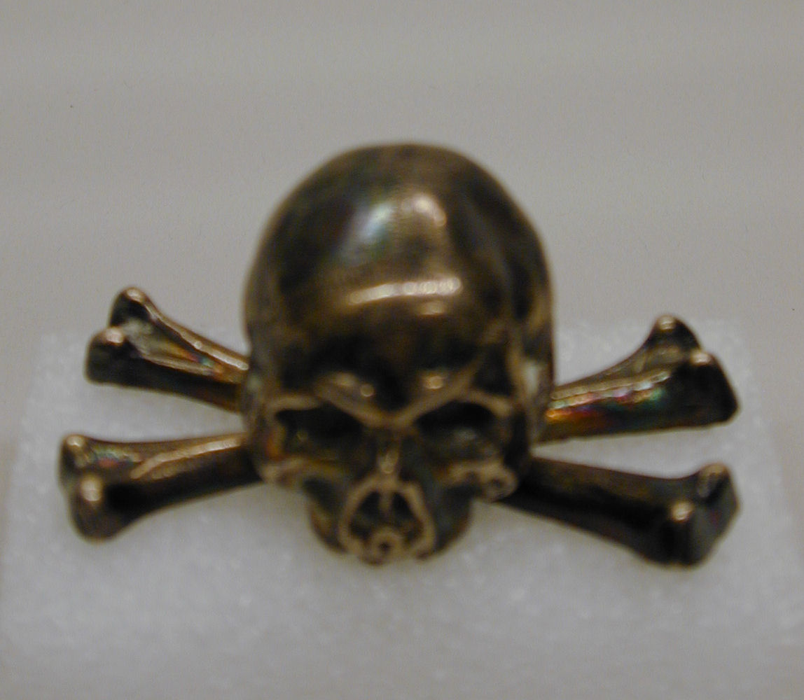 Doodskopje (schedel van Adam) van een kruisbeeld met onder aan een pen, waaraan twee gekruiste beenderen