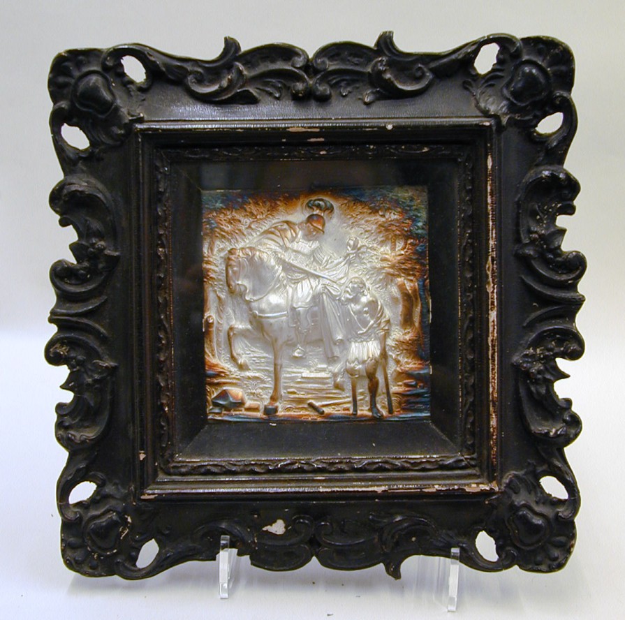 Zilveren reliëf met St. Martinus, achter glas in versierde houten lijst