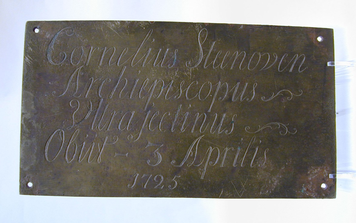 Koperen plaat met "Cornelius Steenoven Archiepiscopus Ultrajectinus Obiit 3 Aprilis 1725"