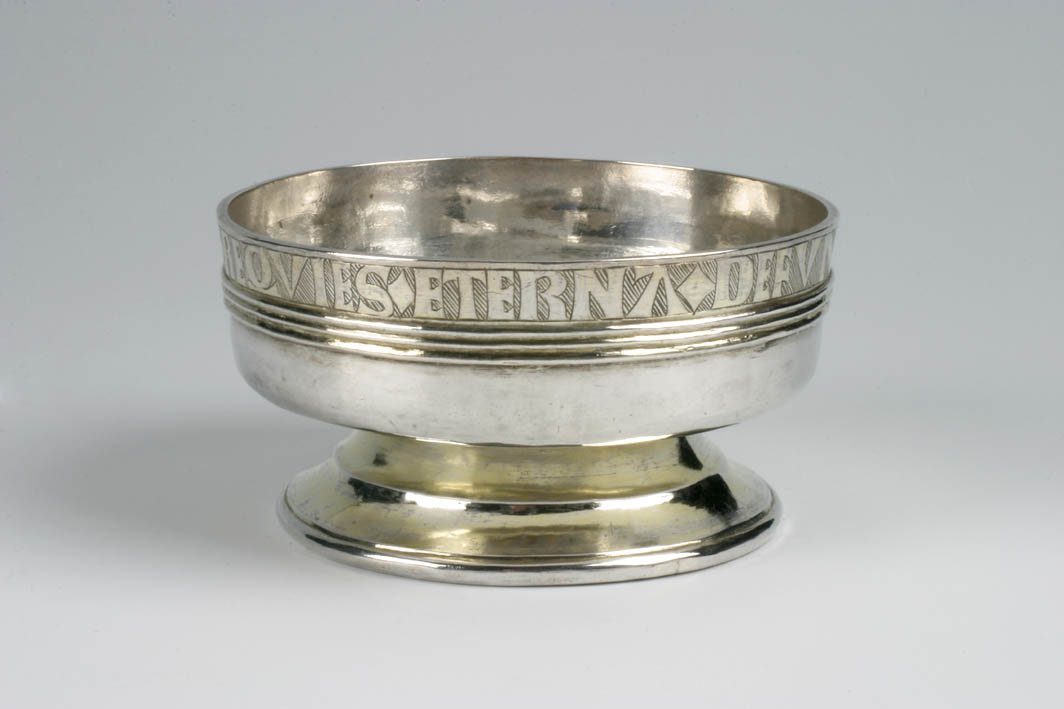 Schaaltje op voet, stapelbeker, vergulde rand met "Laus Deo pax viviset requies aeterna defunctis" (Eer aan God vrede voor de levenden eeuwige rust voor de gestorvenen), met stadsteken Antwerpen, jaarletter F en meesterteken in de vorm van een vogel