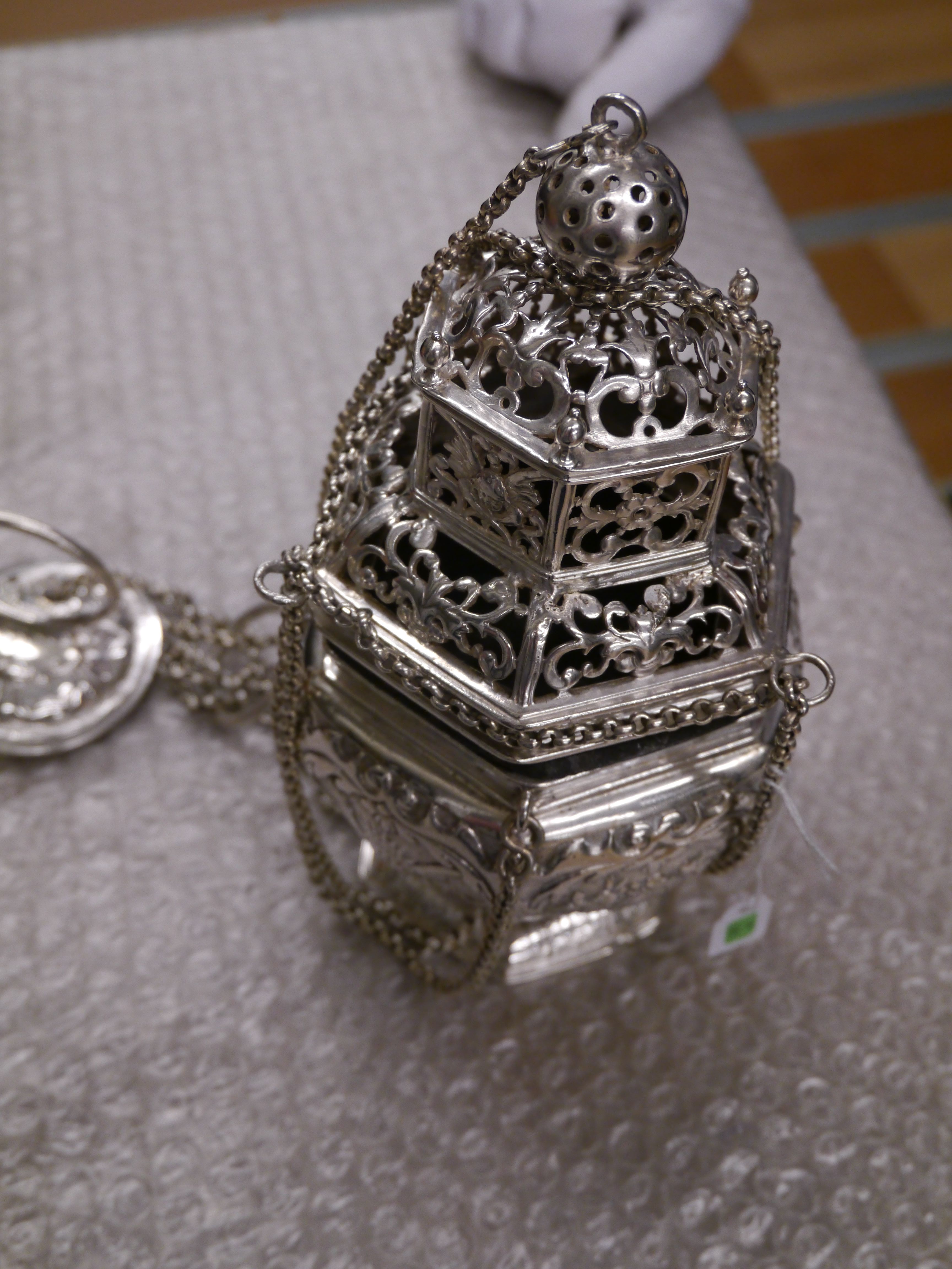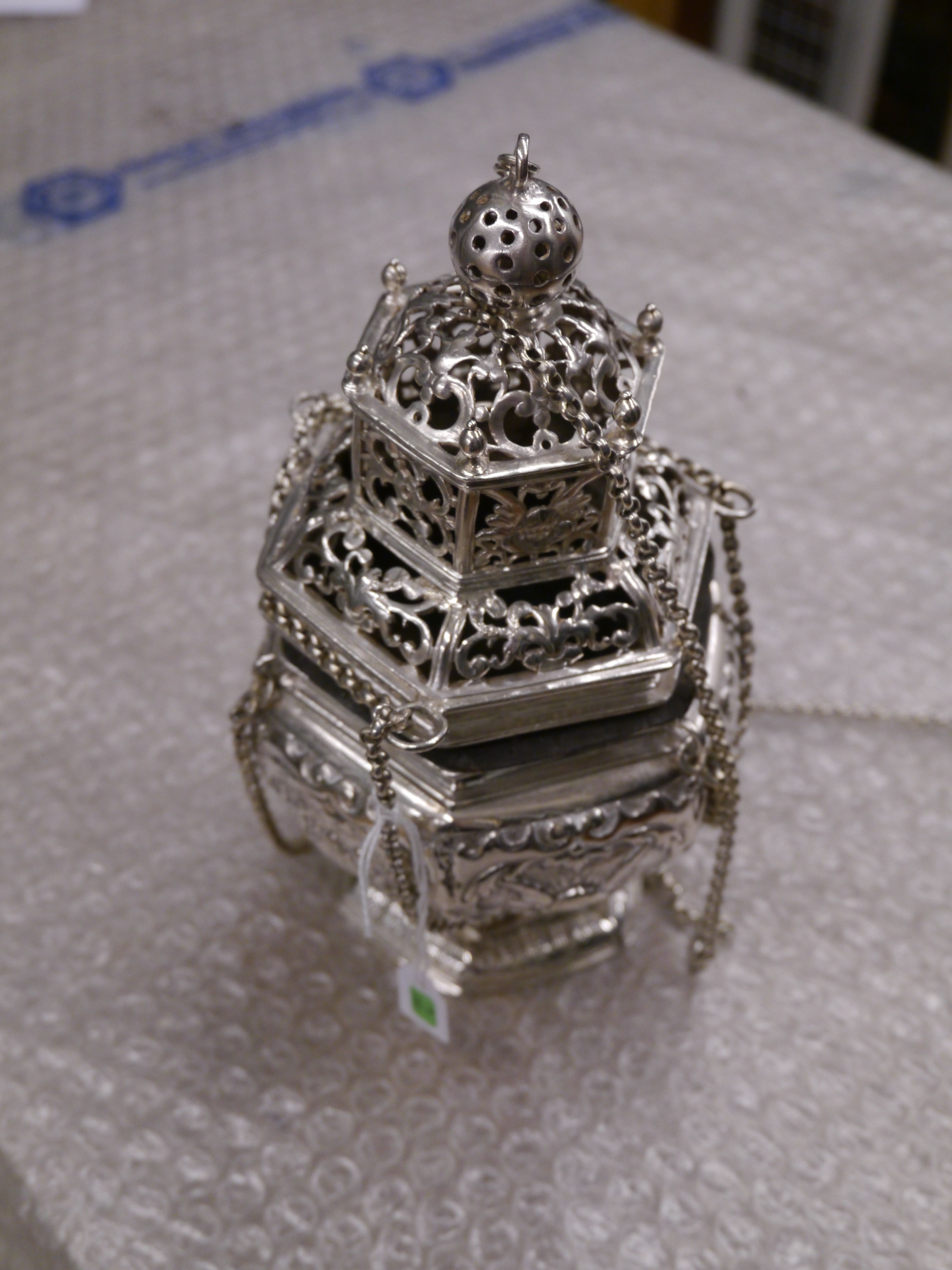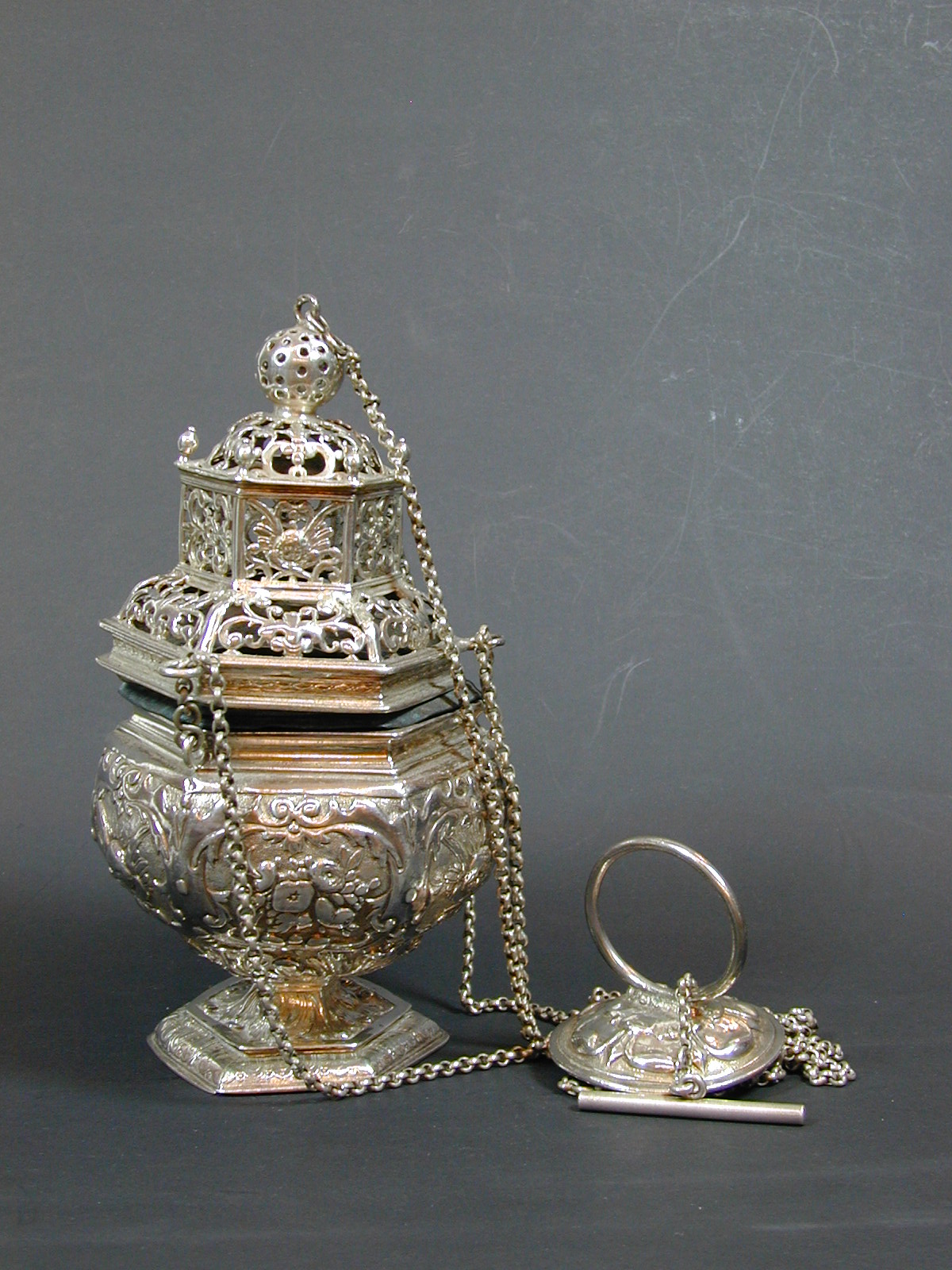 Wierookvat met drie engelenkopjes op deksel, met kettingen, los bakje, afkomstig van H. Maria Minor