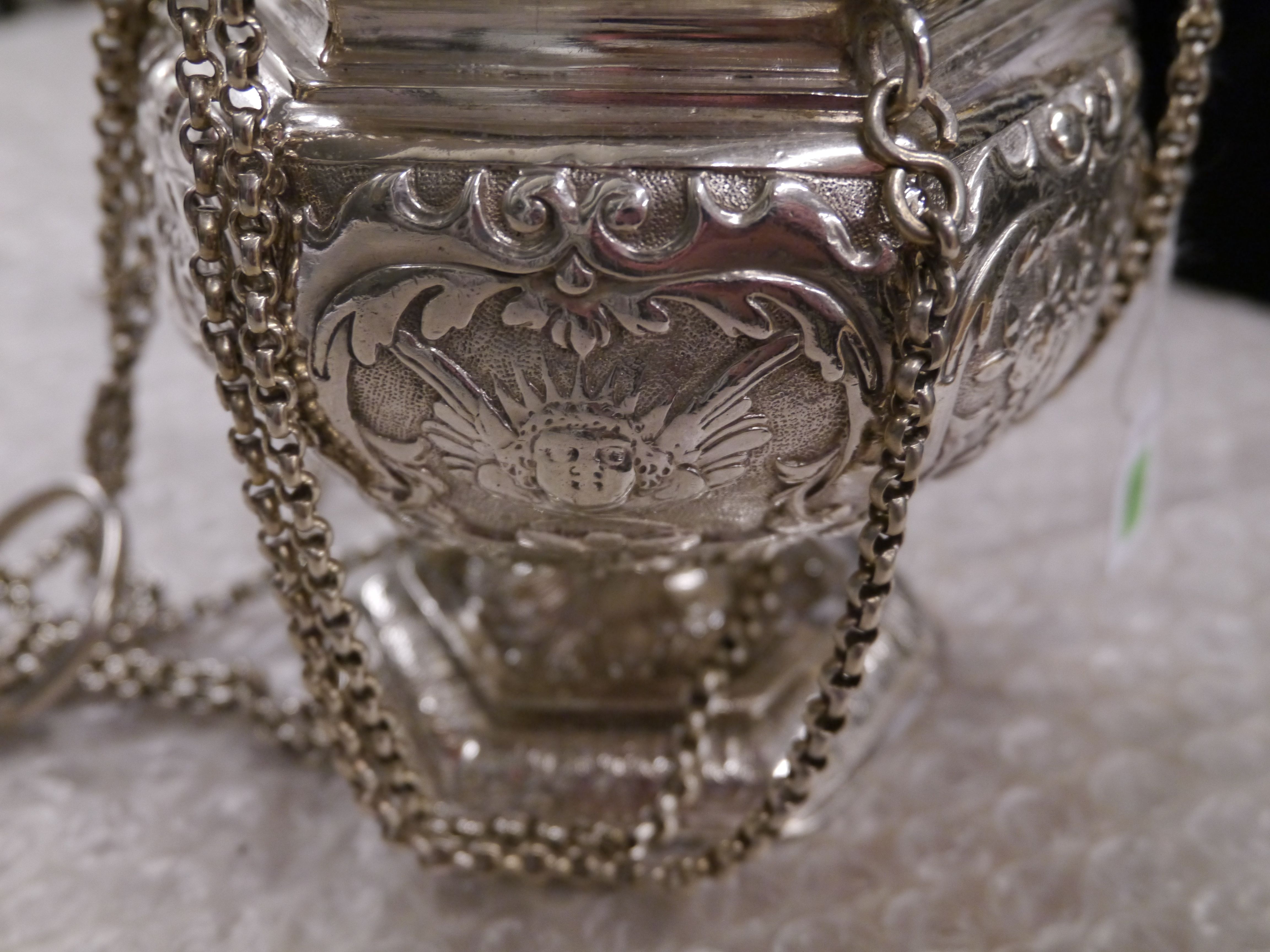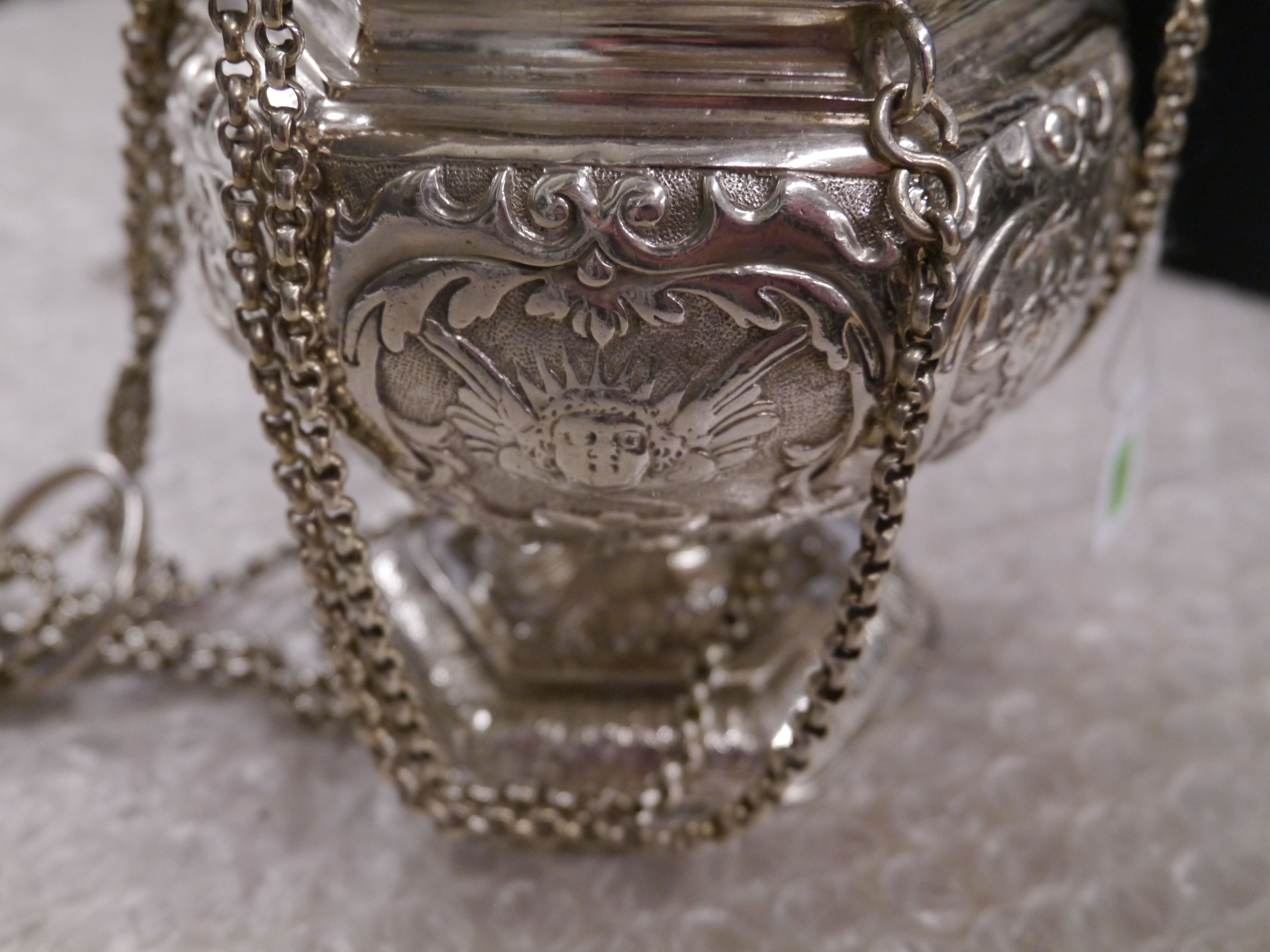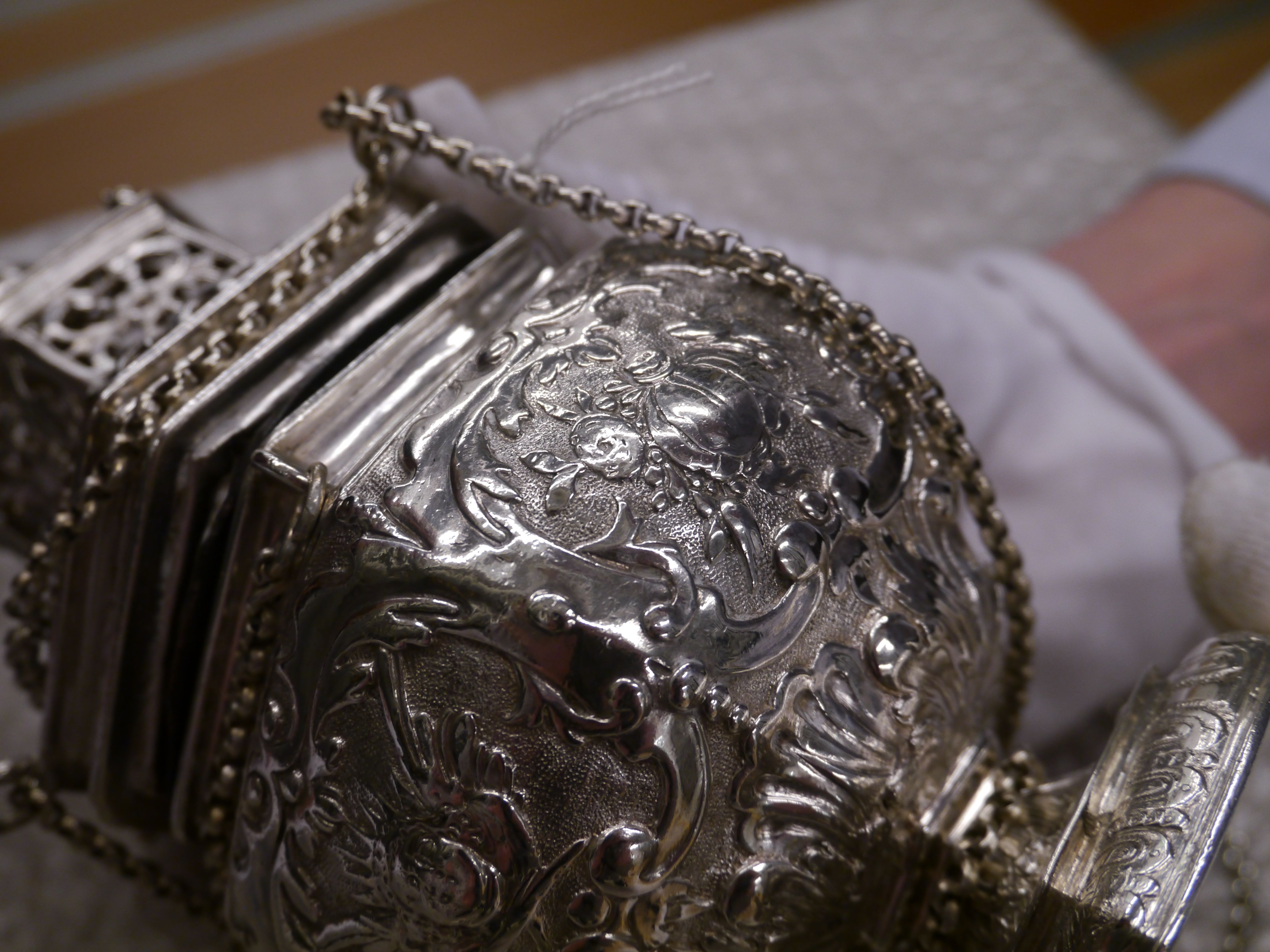 Wierookvat met drie engelenkopjes op deksel, met kettingen, los bakje, afkomstig van H. Maria Minor