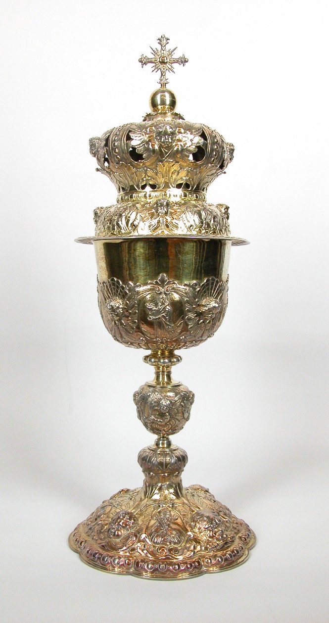 Expositieciborie met deksel met kroon waarop offer van Abraham, evangelistensymbolen op voet