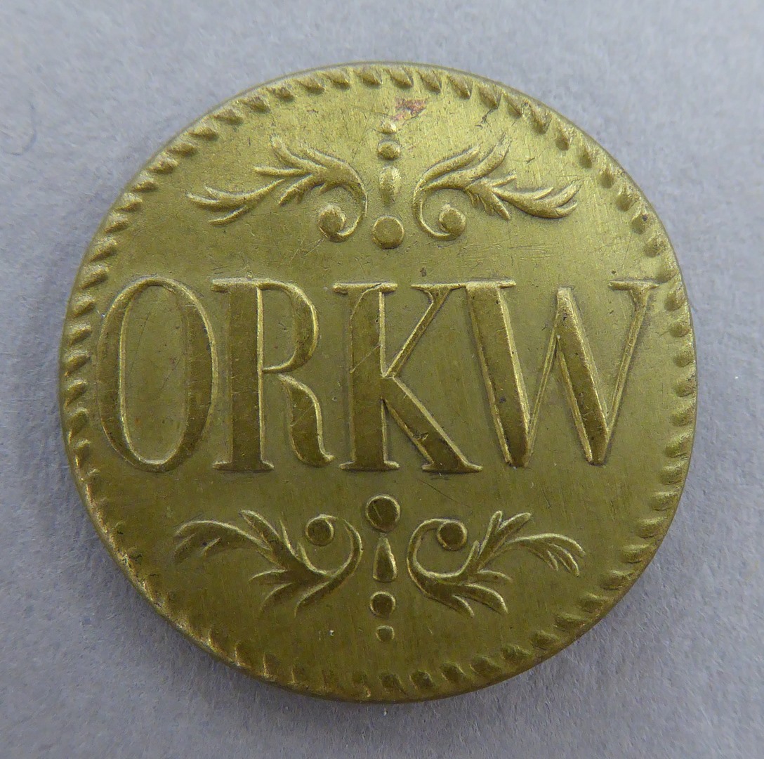 Ronde knoop met versieringen waartussen "ORKW" (Oud Rooms Katholiek Weeshuis)