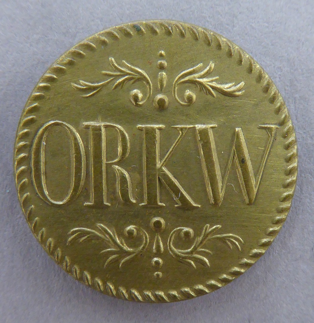 Ronde knoop met versieringen waartussen "ORKW" (Oud Rooms Katholiek Weeshuis)