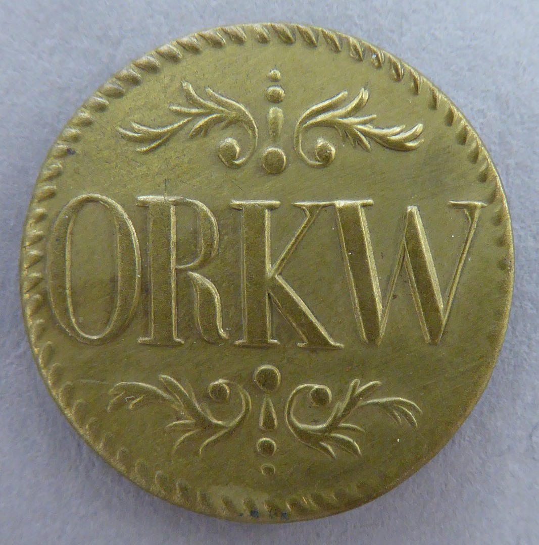 Ronde knoop met versieringen waartussen "ORKW" (Oud Rooms Katholiek Weeshuis)