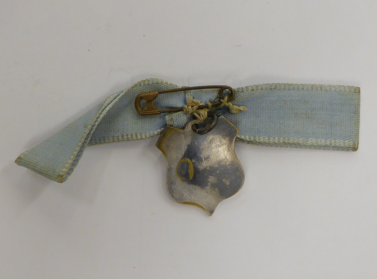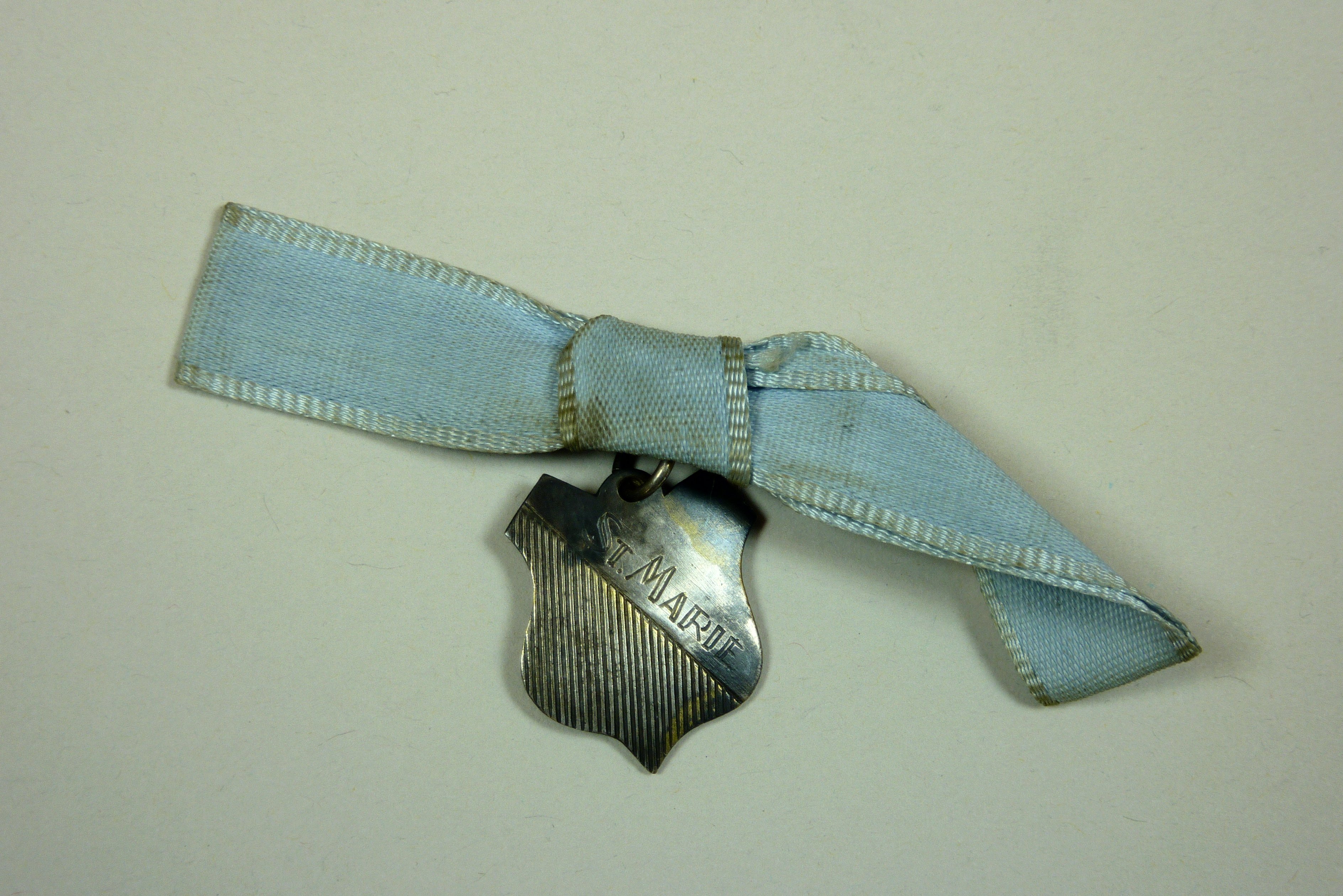 Schildvormige hanger O.K. Vrouwenvereniging "St. Marie" aan blauw strikje
