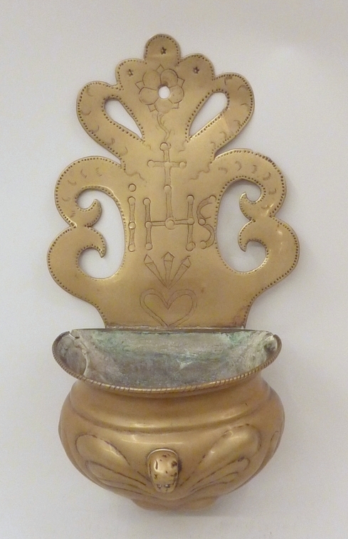 Wijwaterbakje, hartvormig, achterblad versierd met parelrandje en IHS
