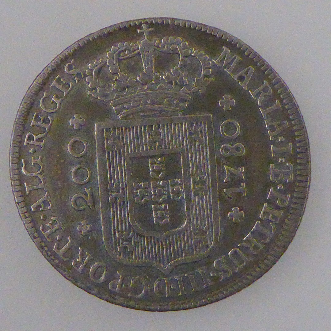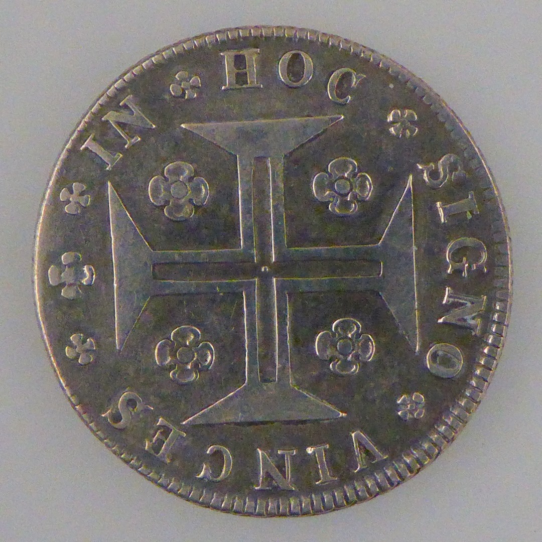 Gedenkpenning Maria I en Petrus III 1780, koninklijk wapen, randschrift, kz. krukkenkruis