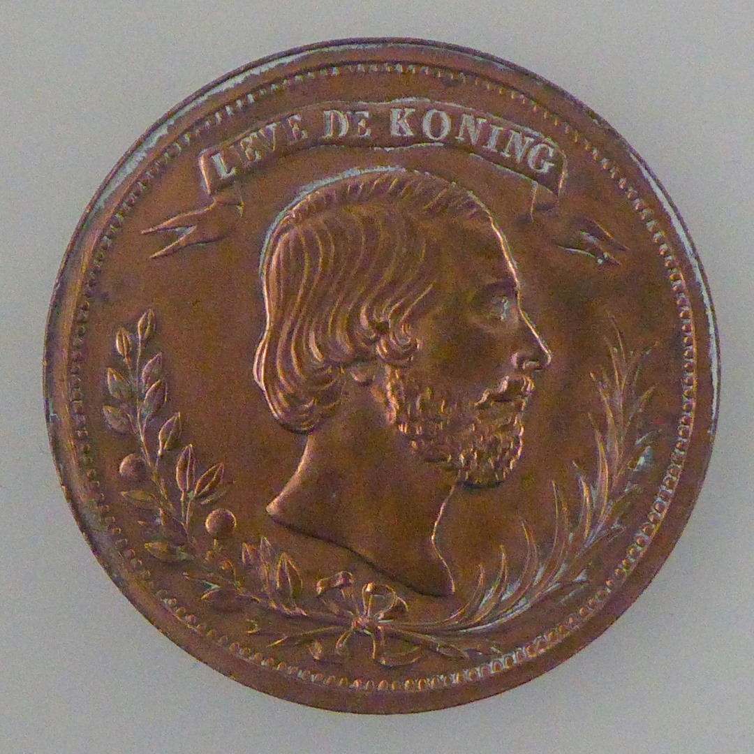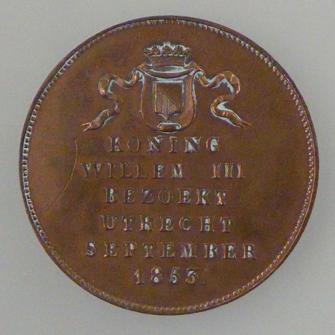 Gedenkpenning bezoek van koning Willem III aan Utrecht, met wapenschild, kz. portret