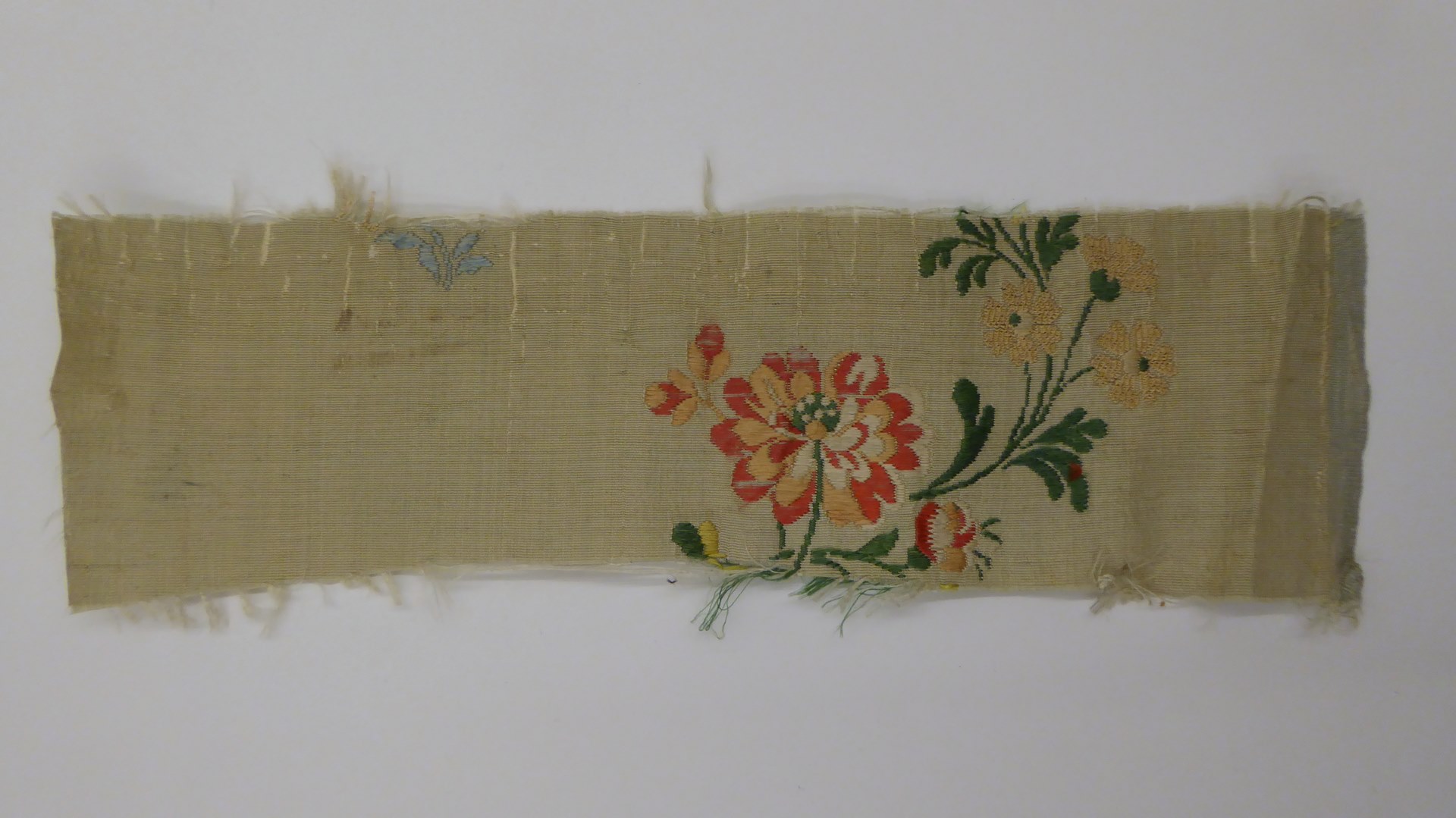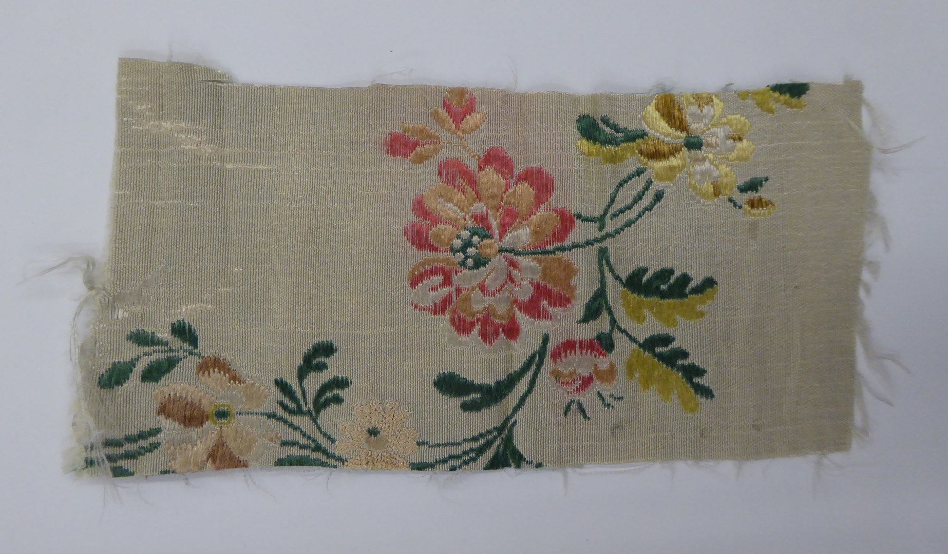 Lichtgroene ripszijde (2 fragmenten) met veelkleurige bloemen