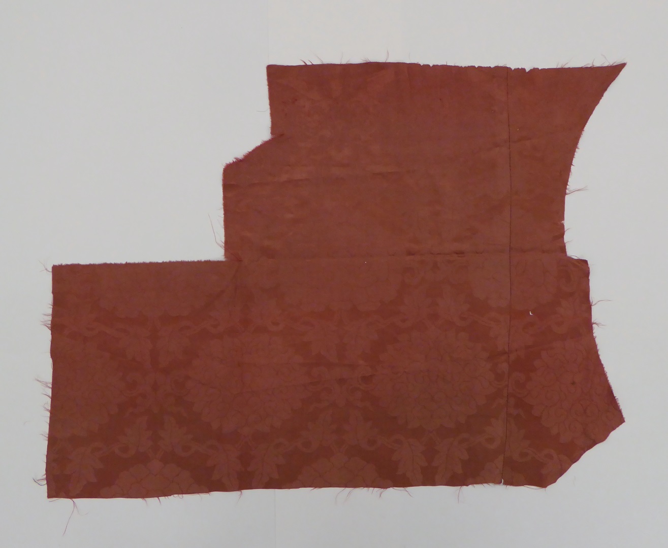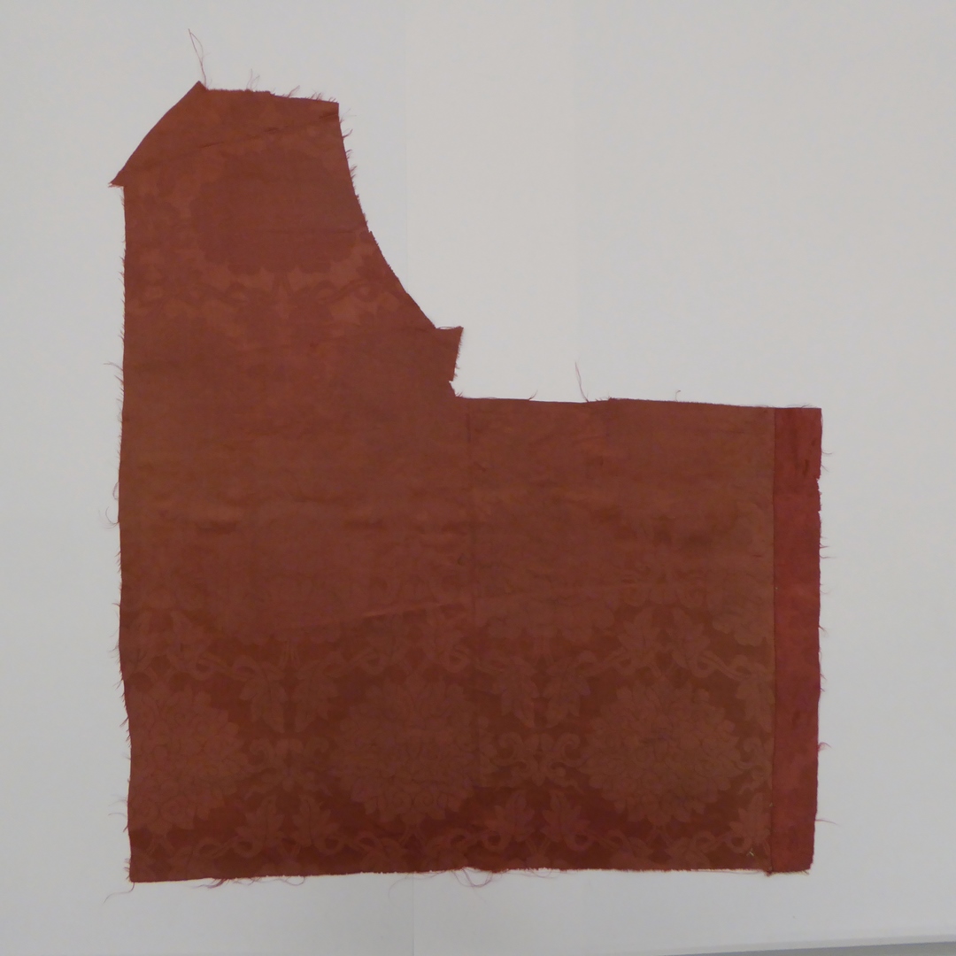 Rode damastzijde (2 fragmenten) met bloemen en rankenmotief