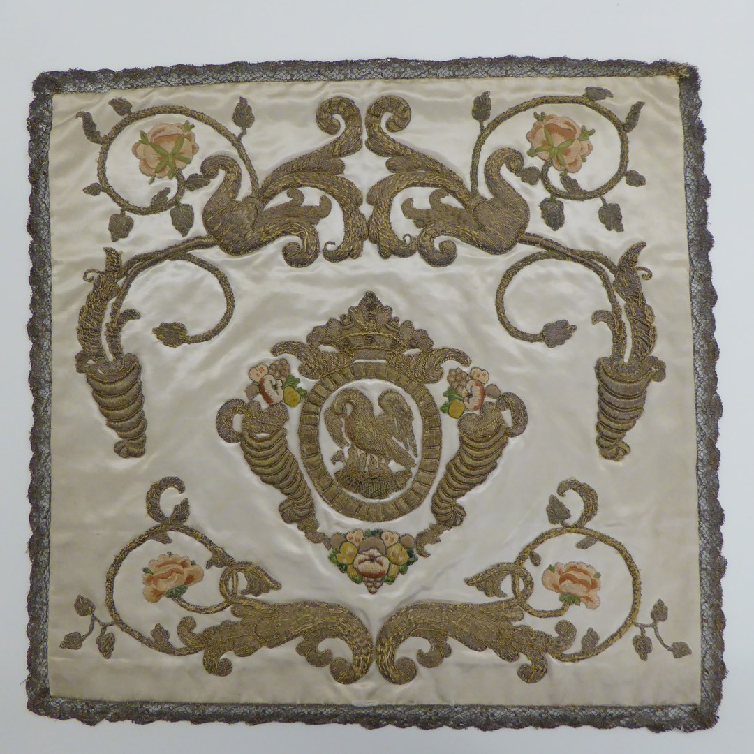 Wit kelkvelum met pelikaan en cornucopiae in gehoogd gouddraad, vruchten en bloemen