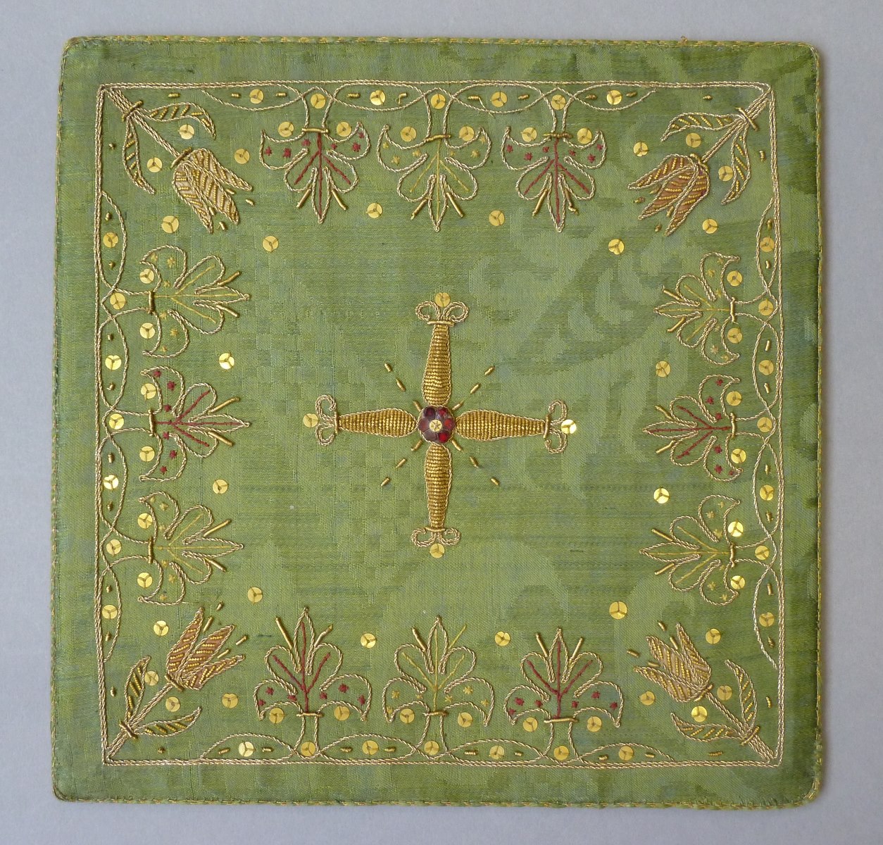 Groene palla met kruisje van gehoogd gouddraad, granaatjes en bloemranken