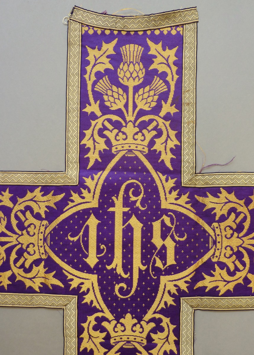 Paars kazuifelkruis met goudgeel ingeweven distelmotief, midden in IHS