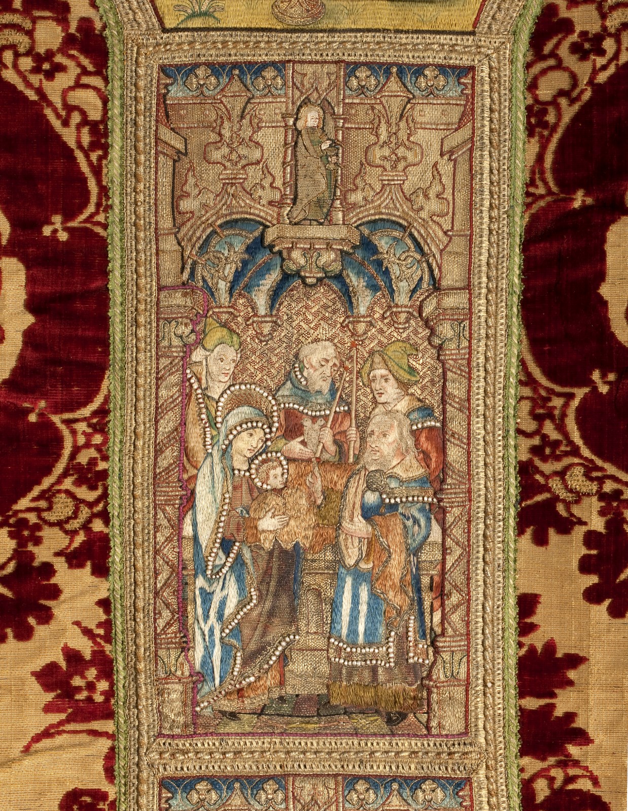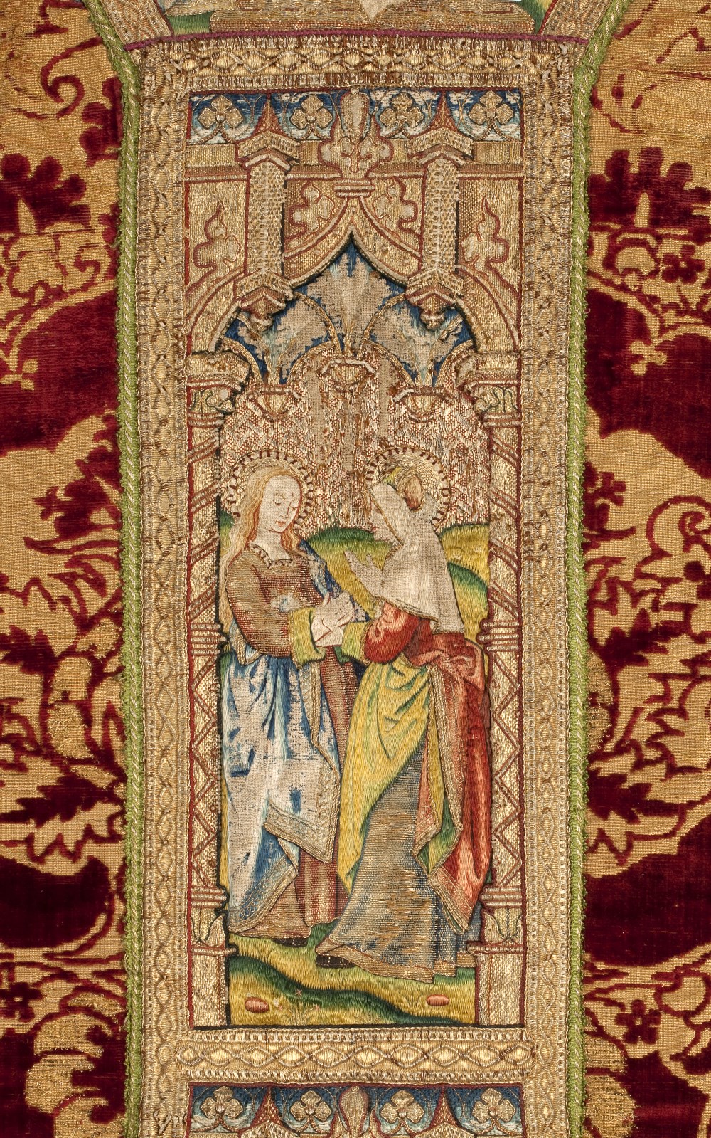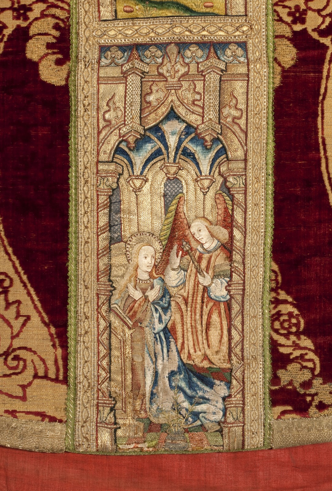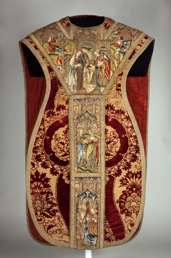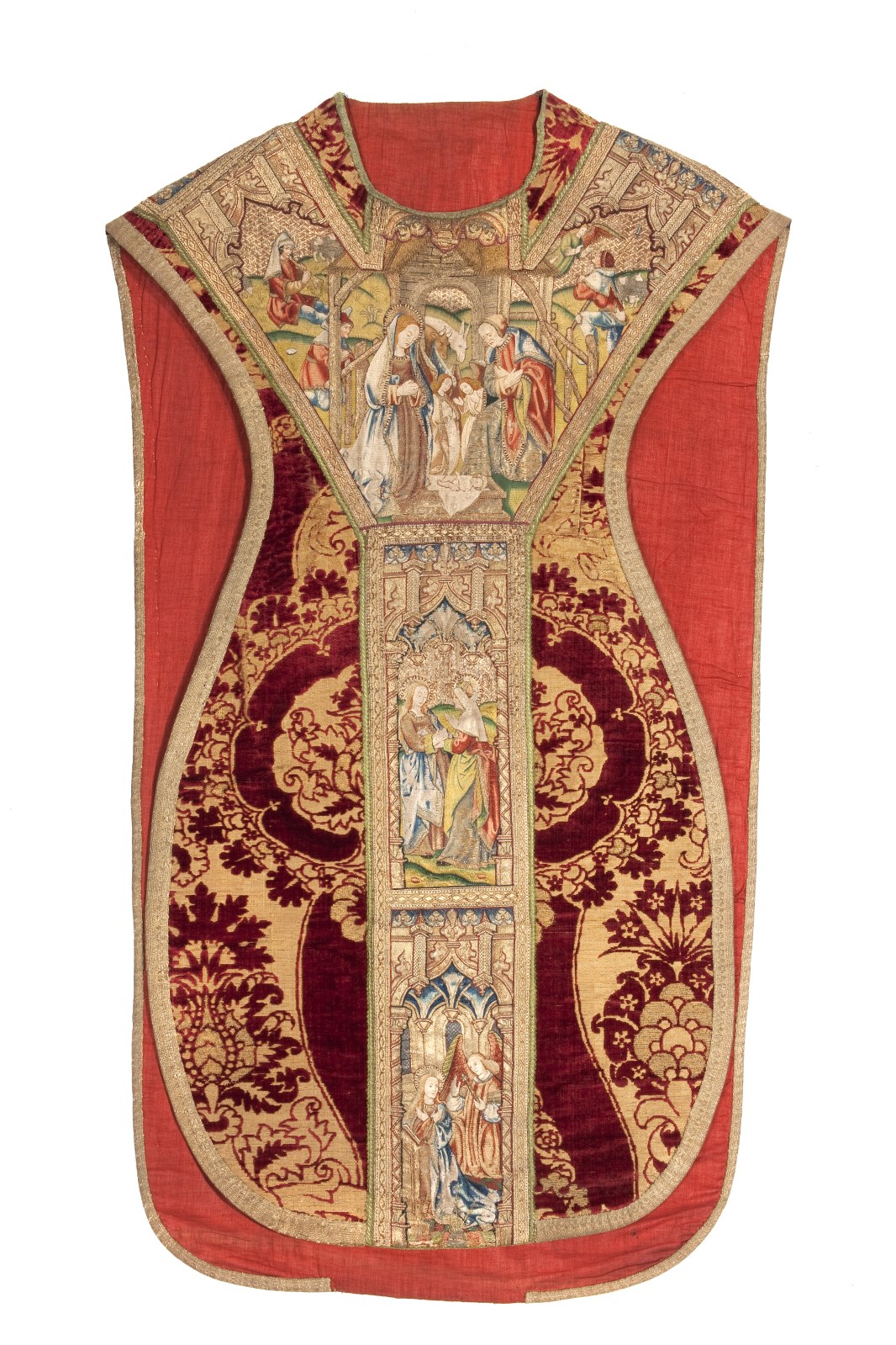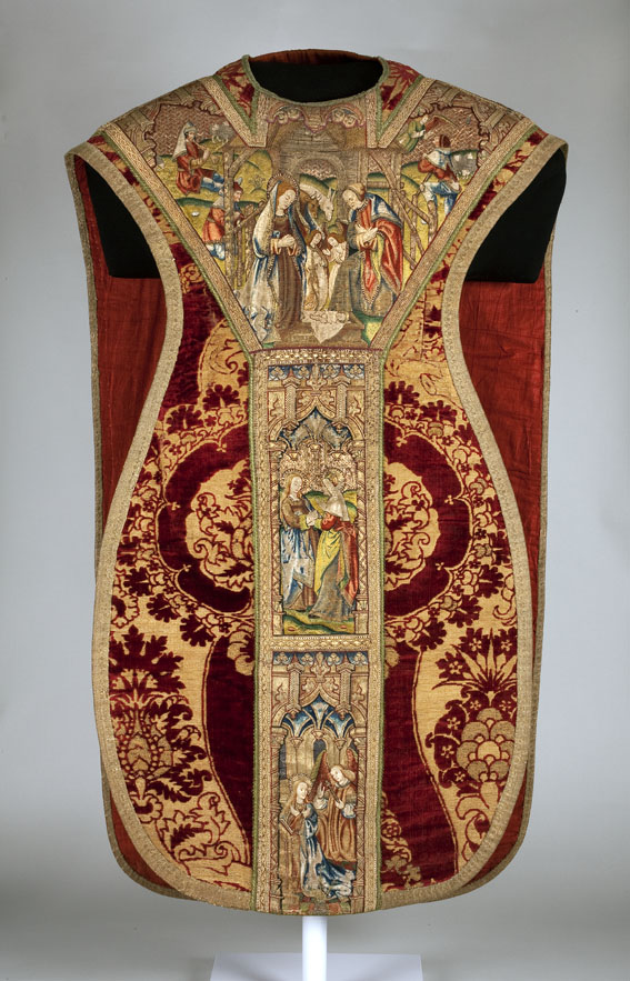 Rood kazuifel met voorstellingen uit het leven van Maria, waaronder de geboorte, visitatie en annunciatie