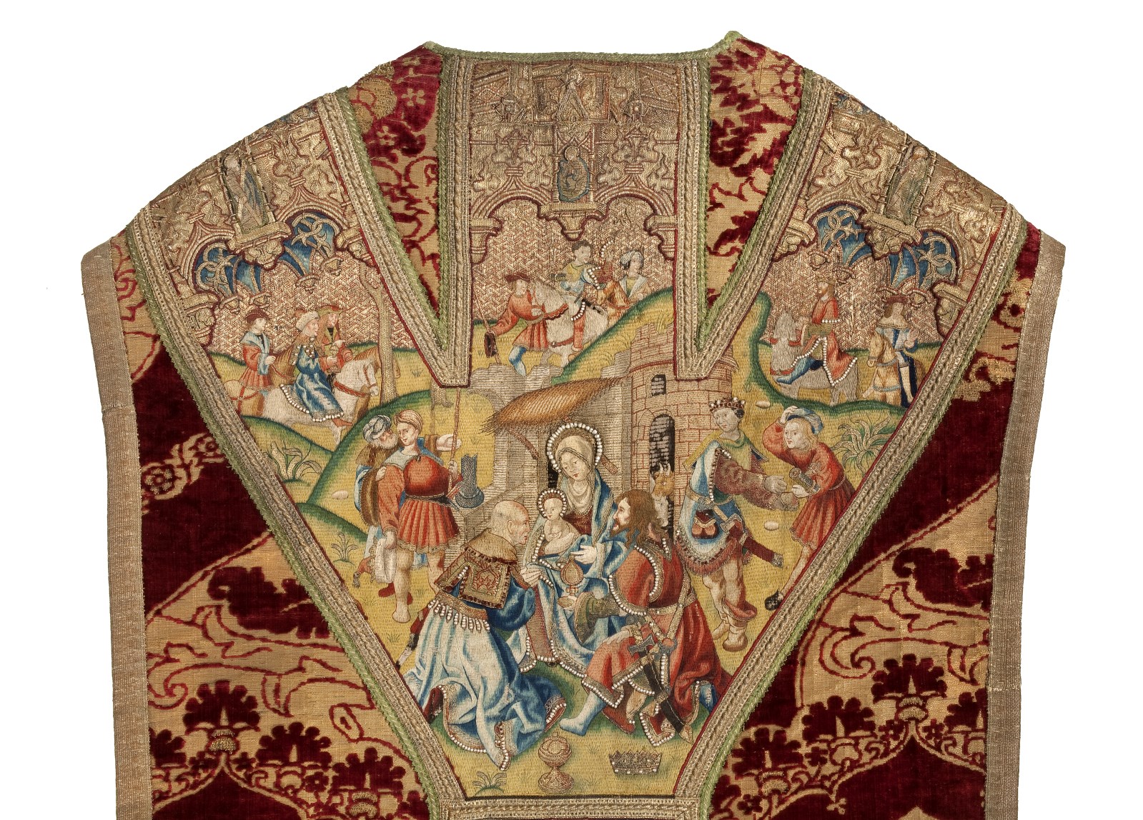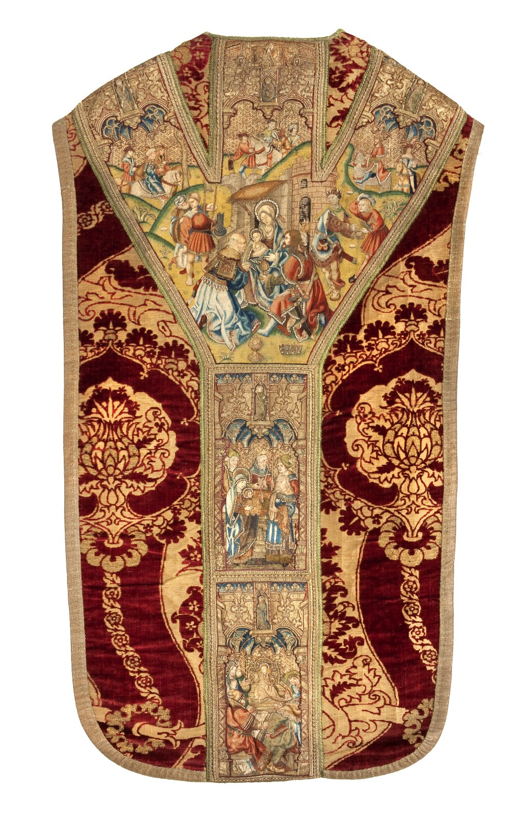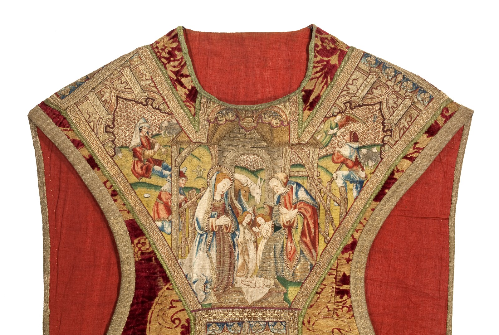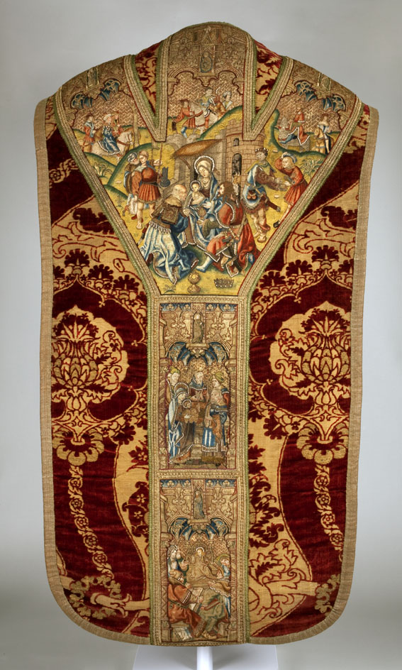 Rood kazuifel met voorstellingen uit het leven van Jezus. Op de voorzijde de geboorte van Christus, de visitatie en de annunciatie, op de achterzijde de aanbidding der koningen, de presentatie van Jezus in de tempel en de twaalfjarige Jezus in de tempel. De stof is rode fluweelbrokaat met een patroon van bloeiende granaatappels.
