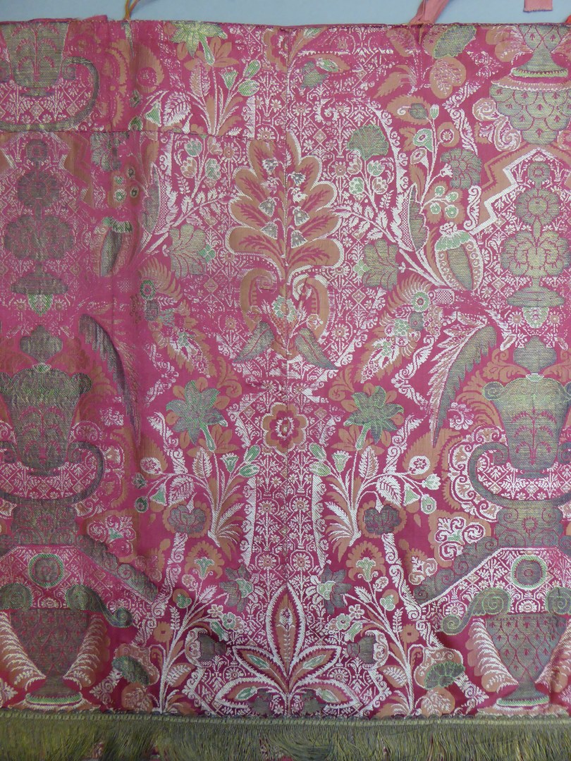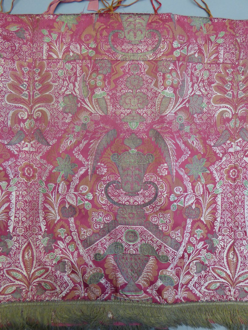 Rode communiebankdwaal van zijdebrokaat met ingeweven patroon van bokalen, vleugels en florale motieven