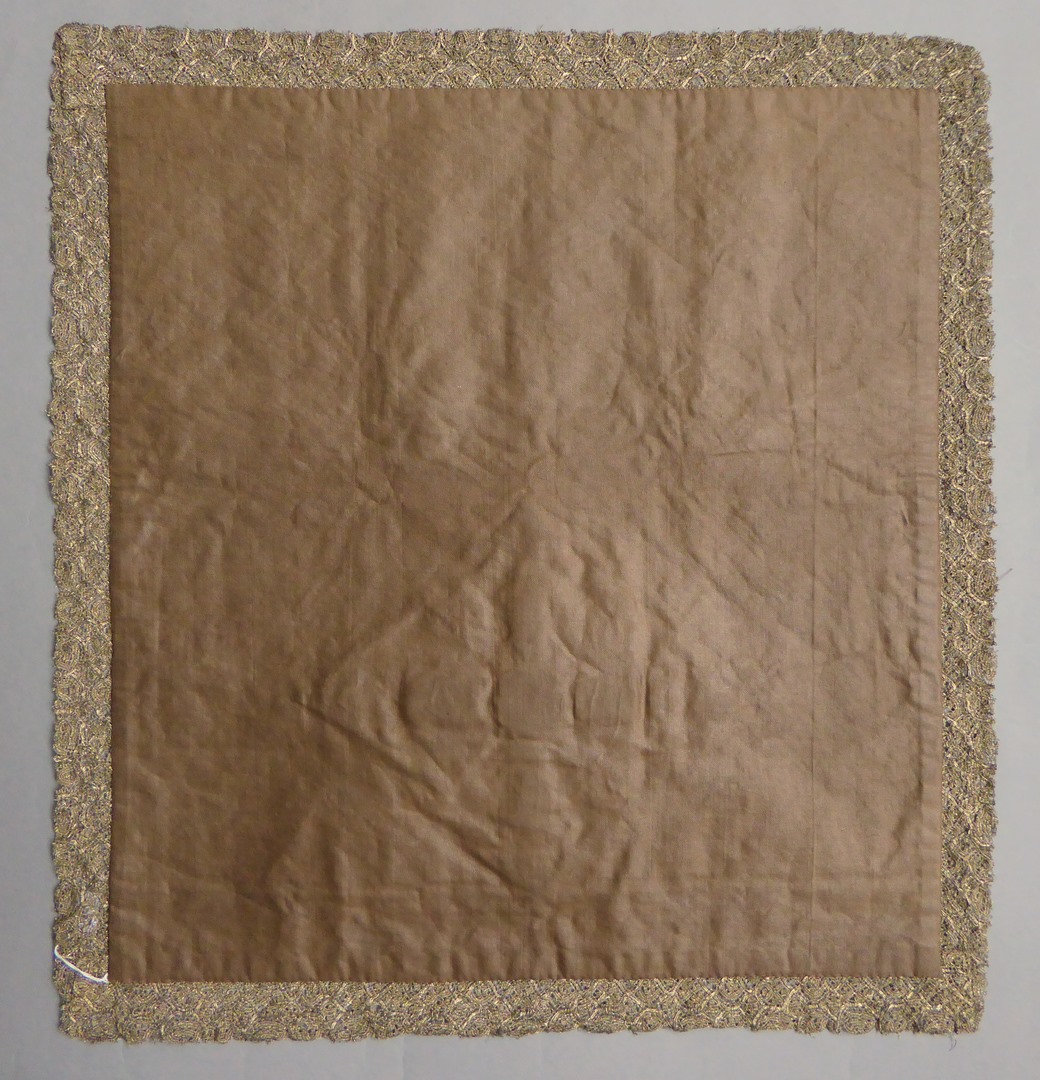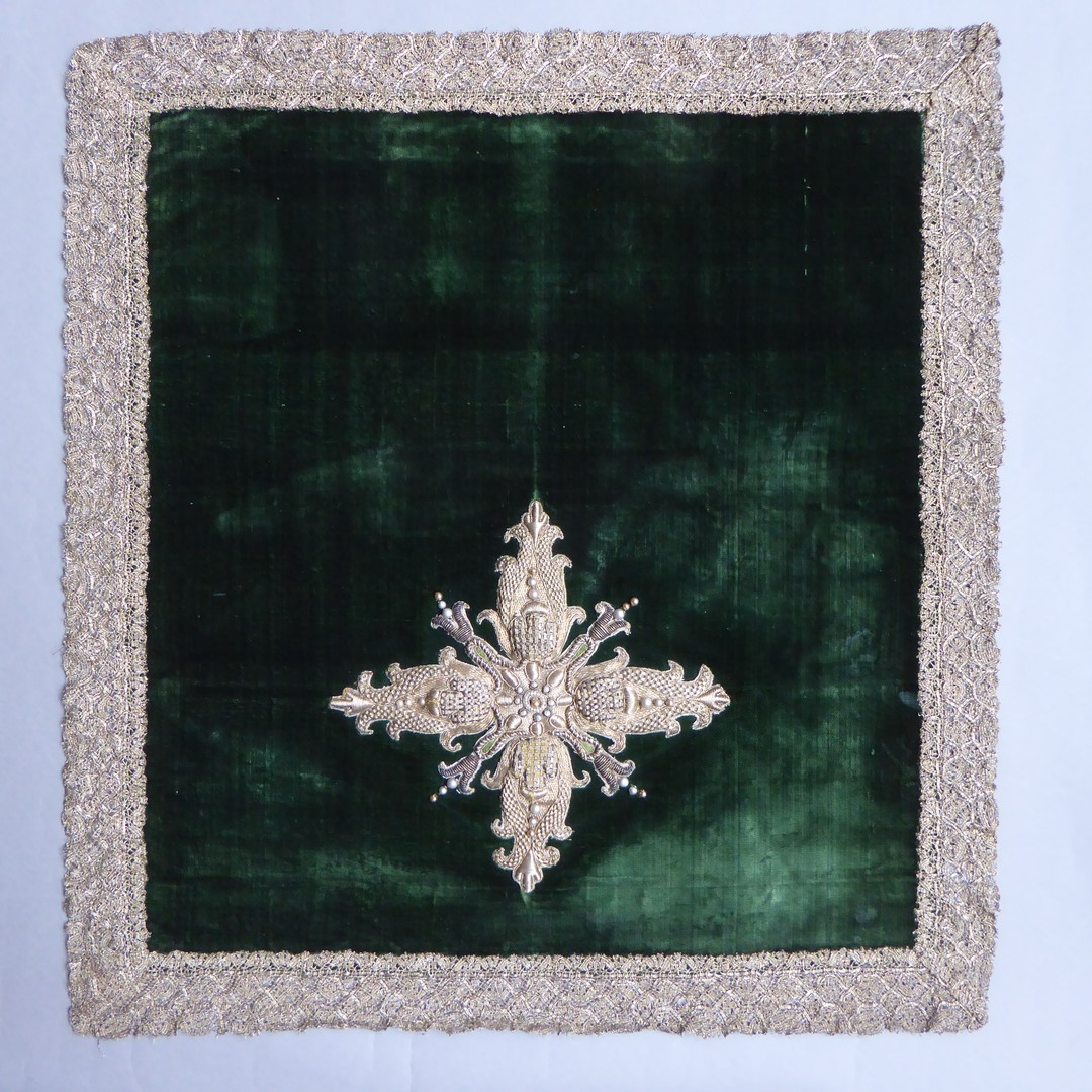 Groen kelkvelum met kruis van gehoogd gouddraad, rand van goudkant