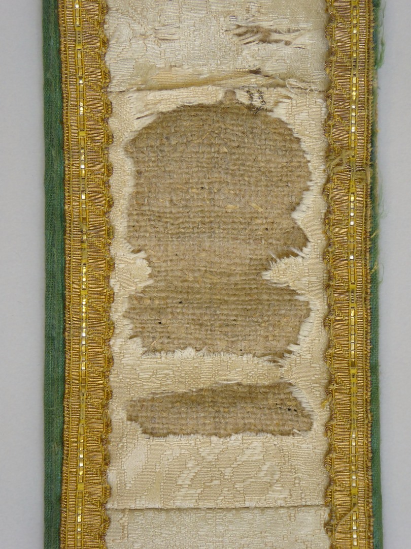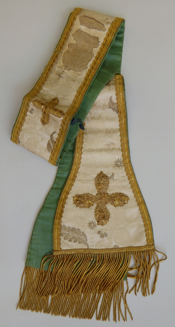 Witte manipel van zilverbrokaat met ingeweven florale motieven