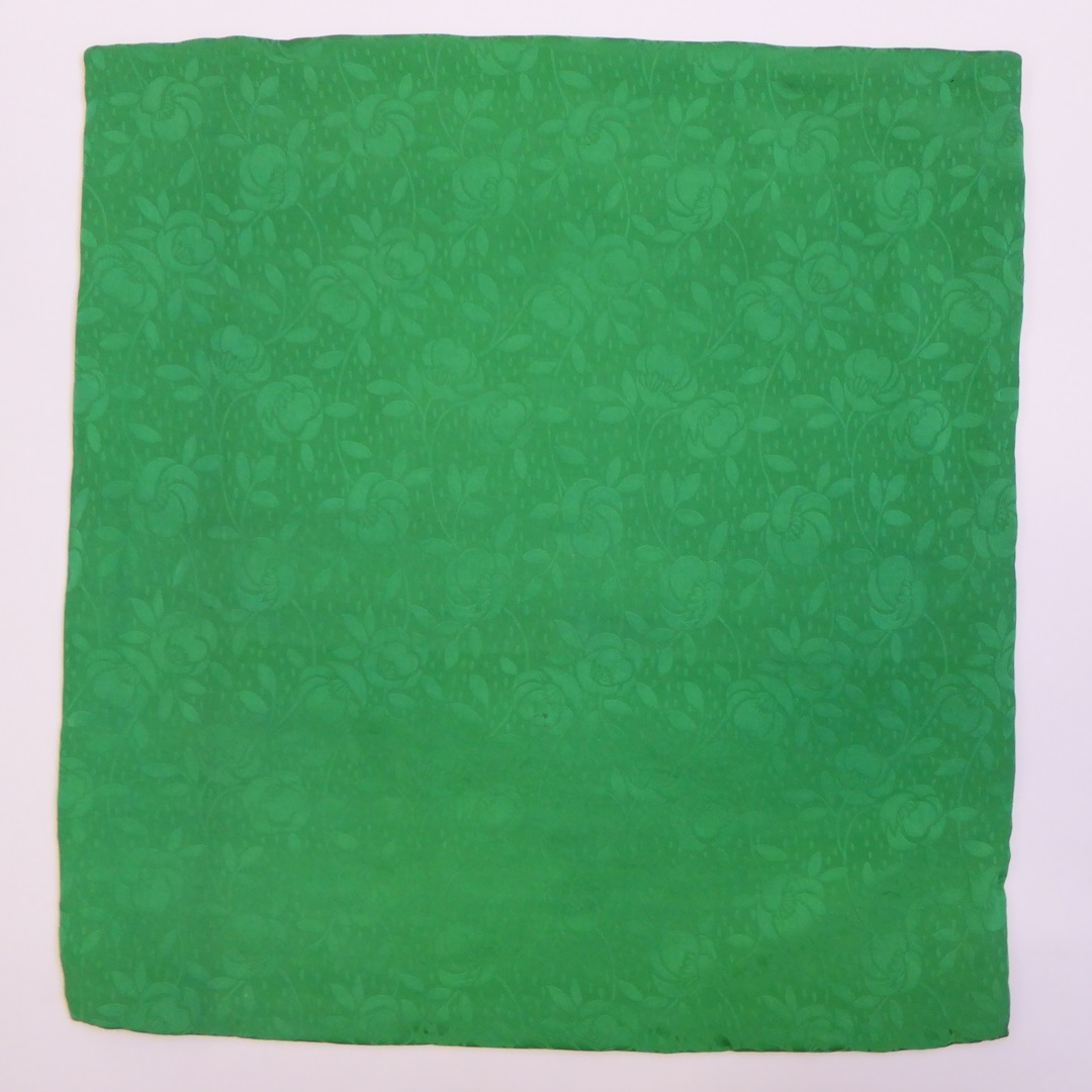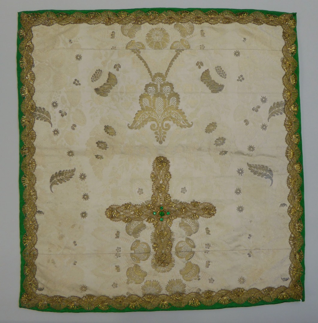 Wit kelkvelum van zilverbrokaat met ingeweven florale motieven, met kruis met vijf groene steentjes