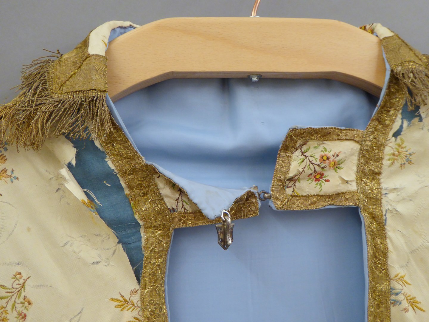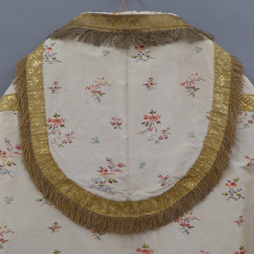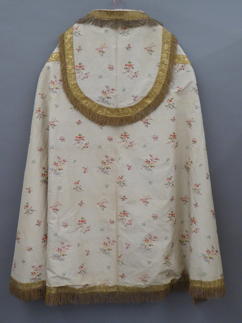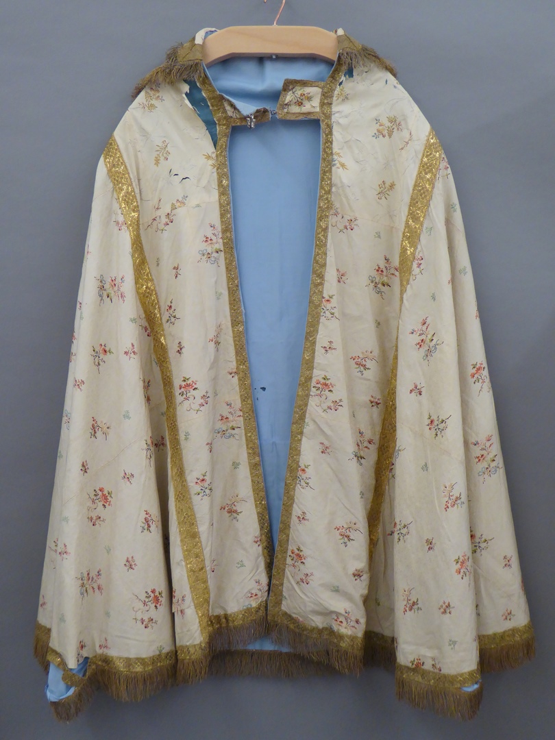 Witte zijden koorkap met ingeweven bladtakjes en geborduurd strooibloemmotief