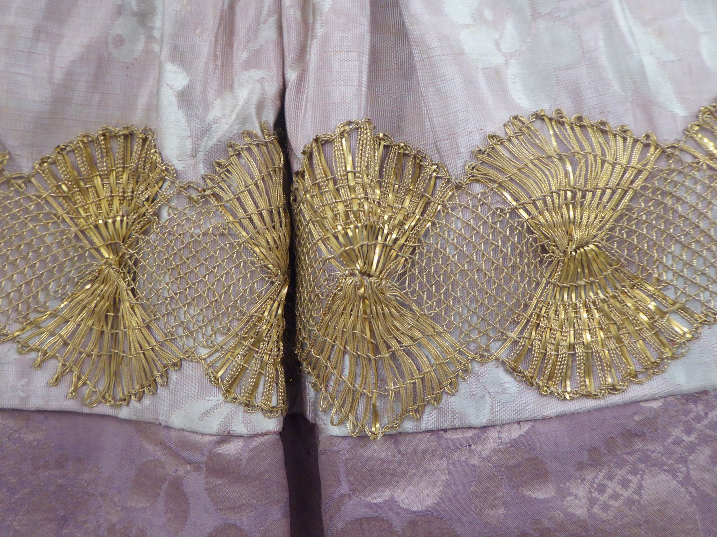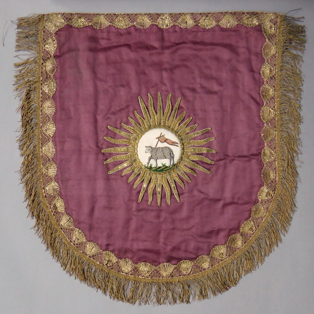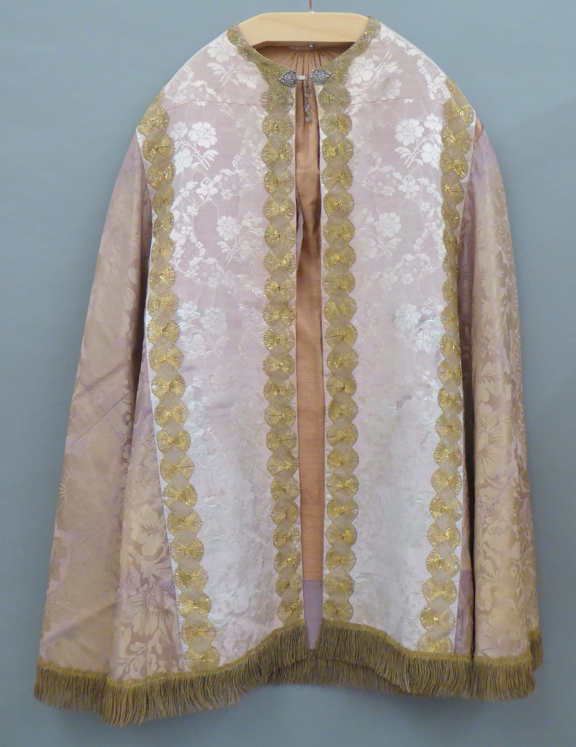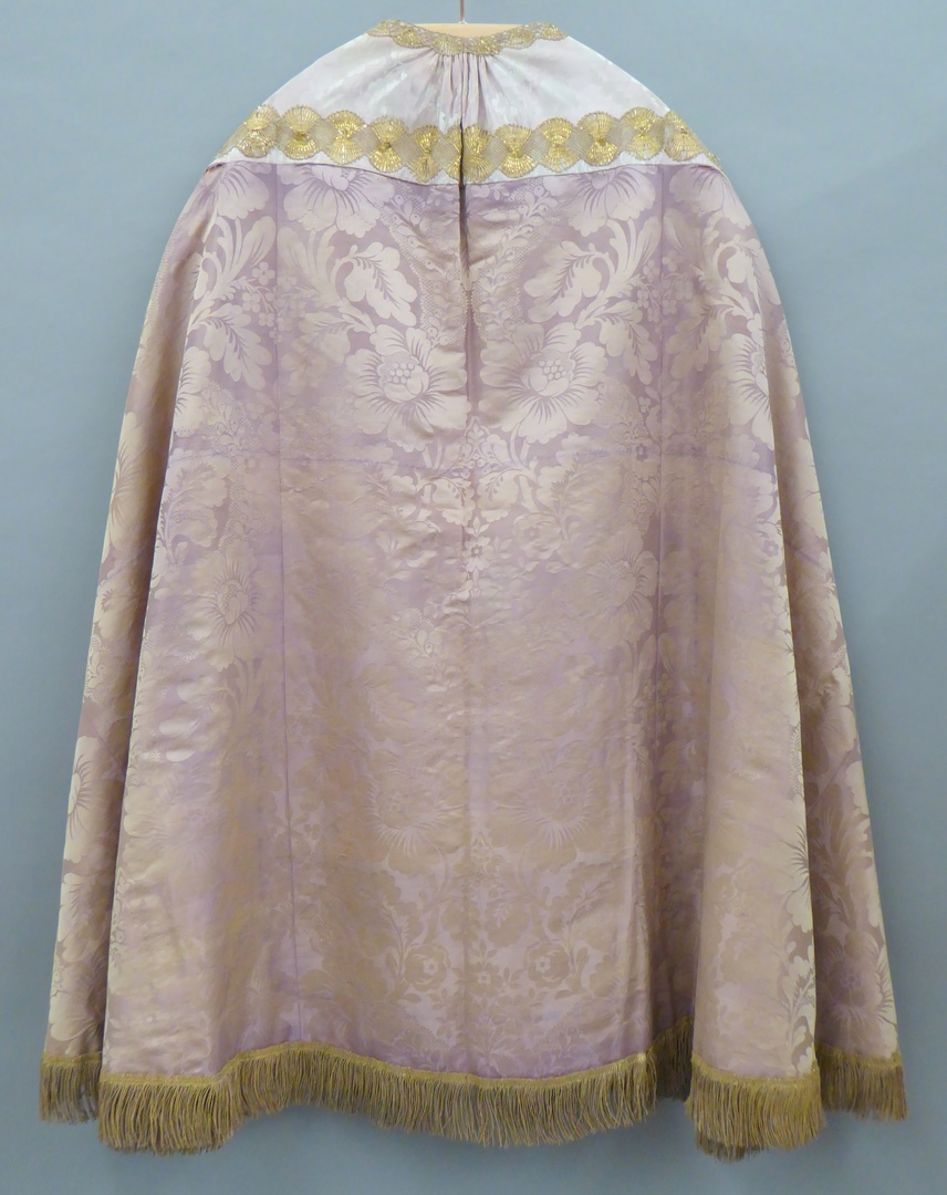 Roze koorkap met ingeweven bloemmotieven, met op donkerroze schild Lam Gods met kruisvaan in stralenkrans