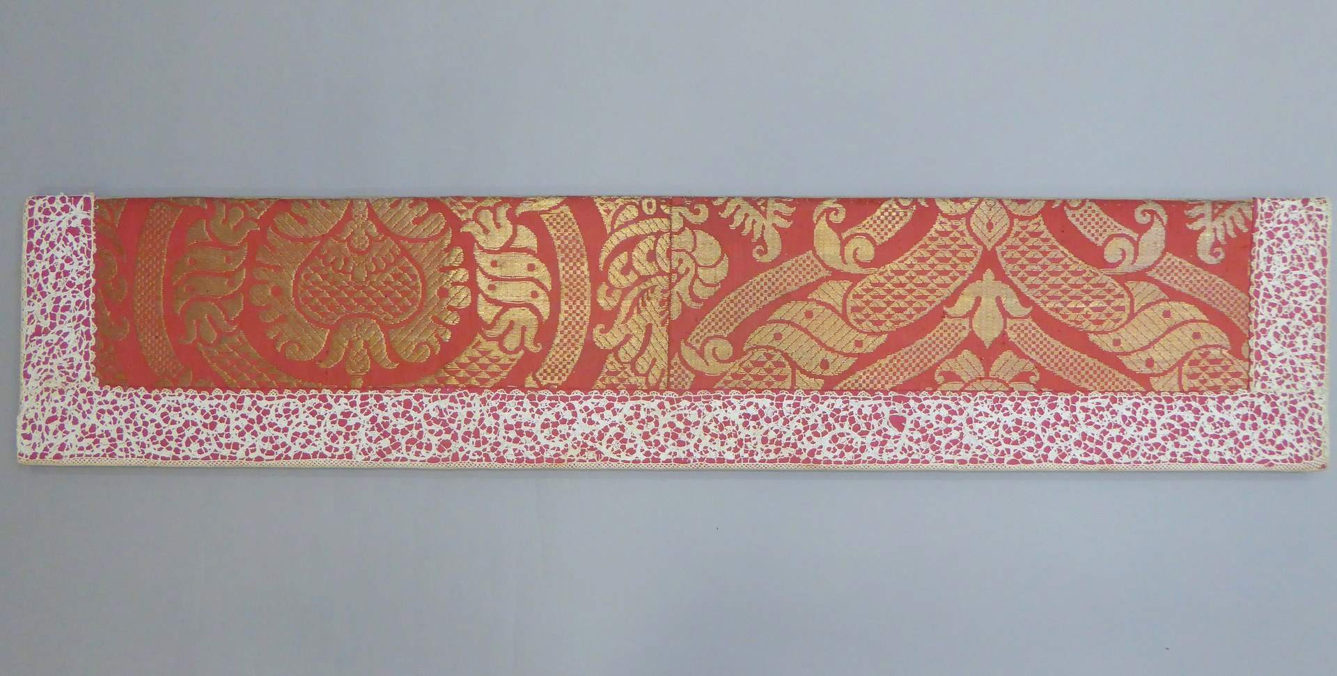 Rood antependium voor kaarsenbank van goudbrokaat met patroon van spitsovalen, met kantrand
