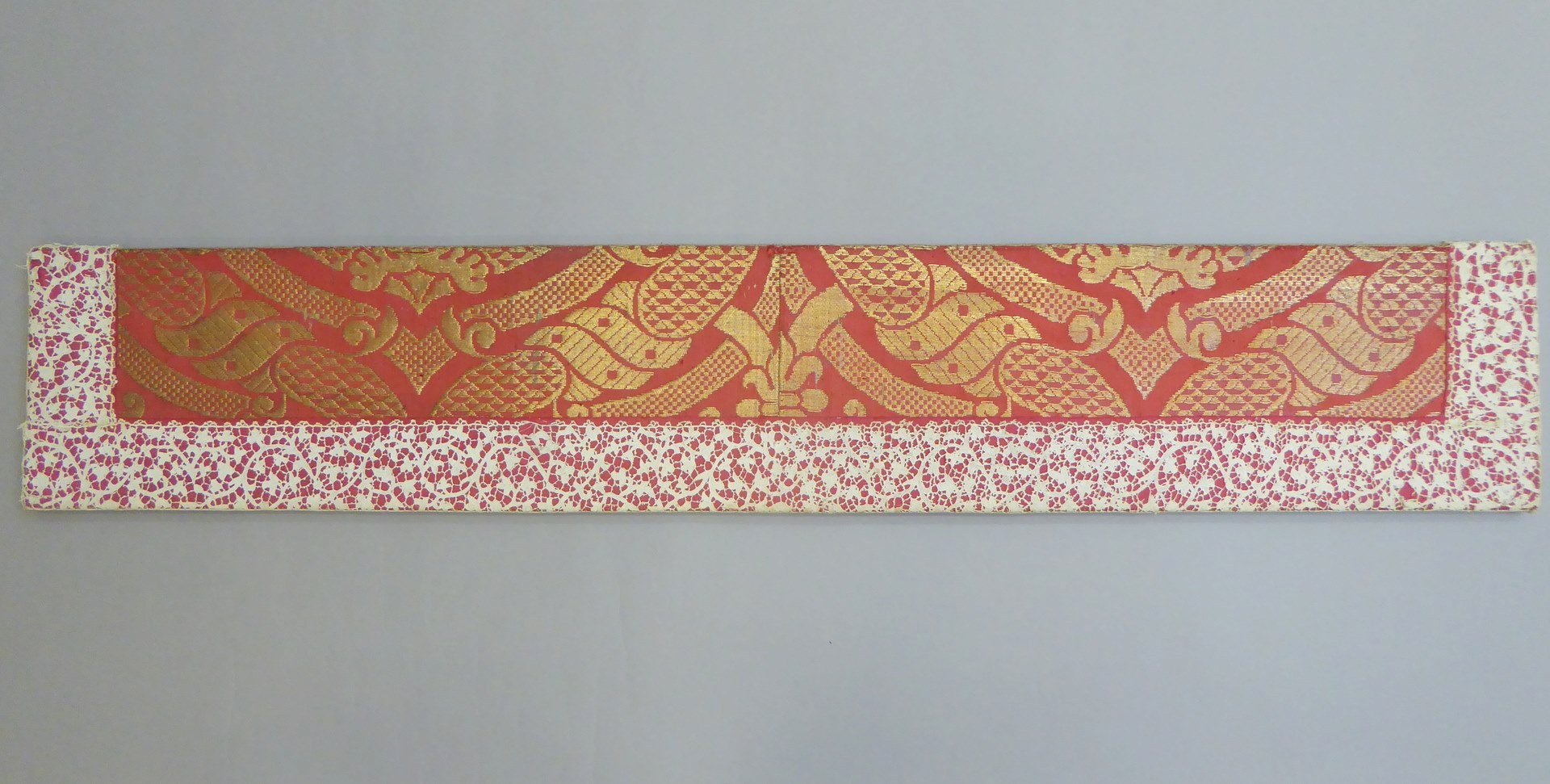 Rood antependium voor kaarsenbank van goudbrokaat met patroon van spitsovalen, met kantrand