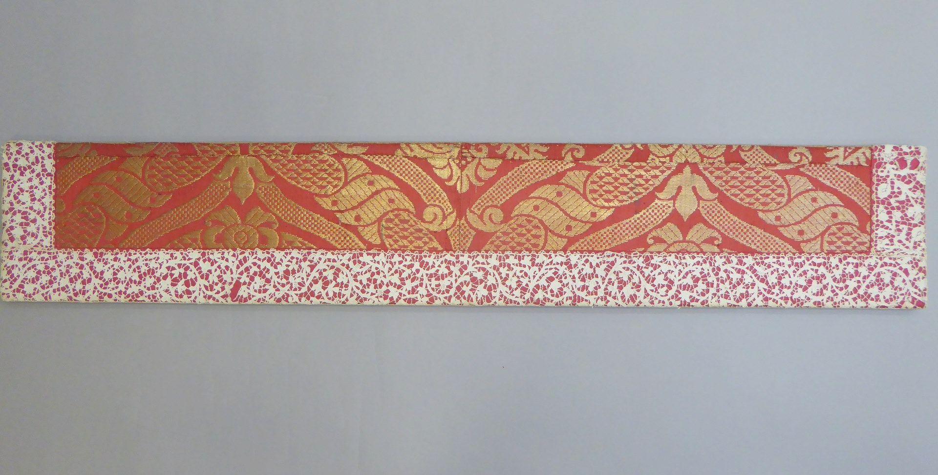 Rood antependium voor kaarsenbank van goudbrokaat met patroon van spitsovalen, met kantrand
