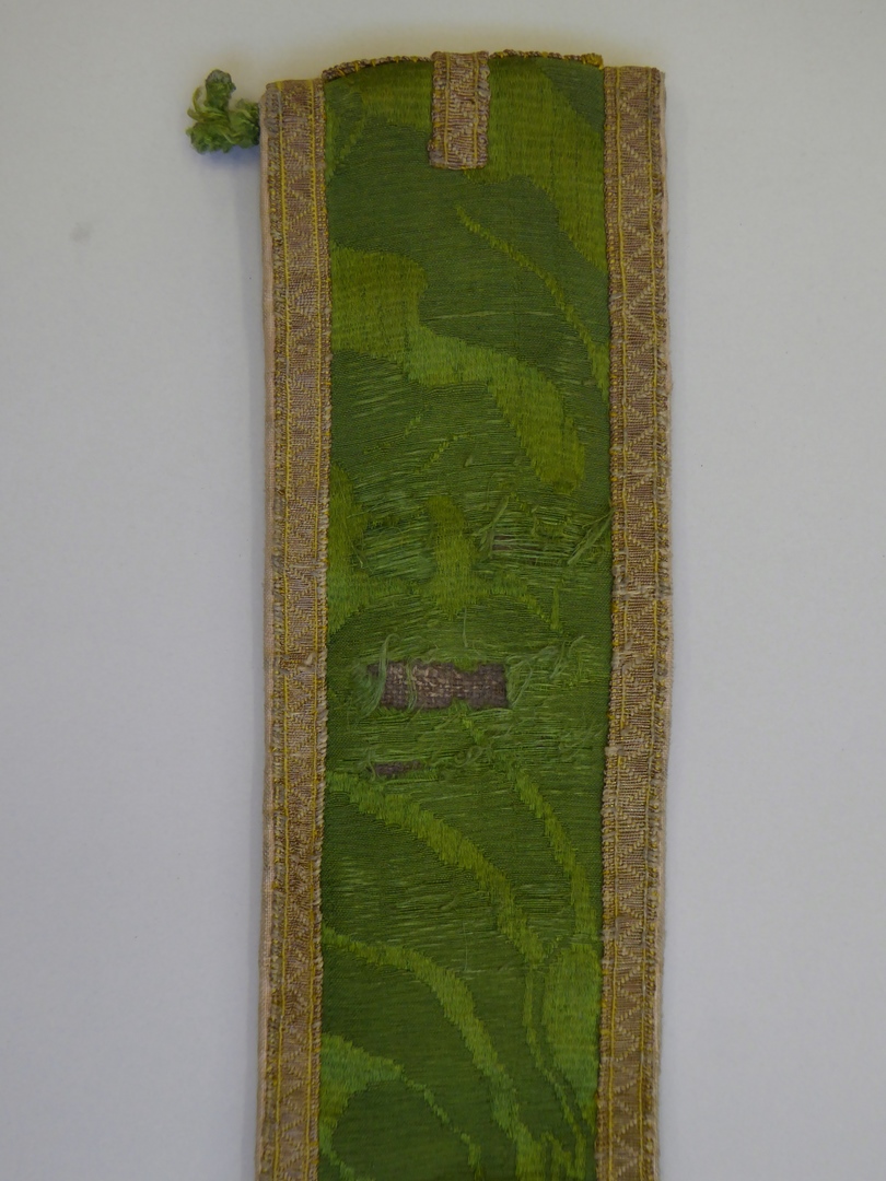 Groene manipel met ingeweven florale motieven, met rand en kruisjes van goudgalon en met goudfranje