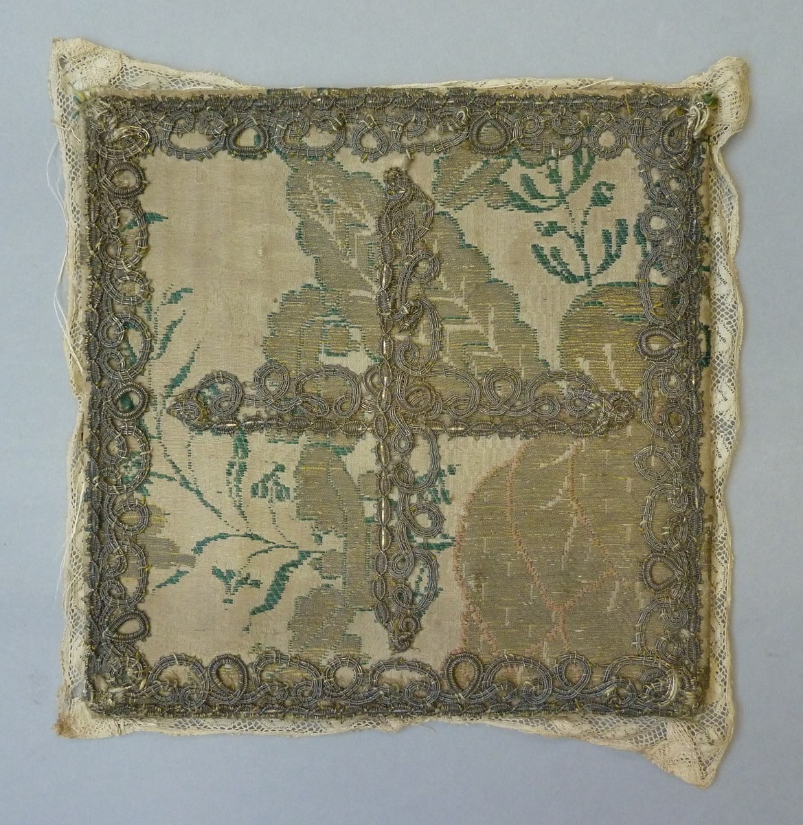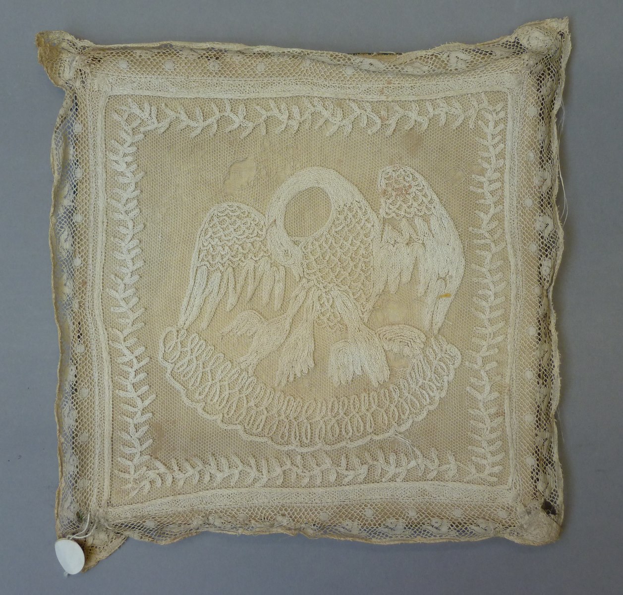 Witte palla met ingeweven bloemmotieven, onderzijde pelikaan op doorgestopte tule