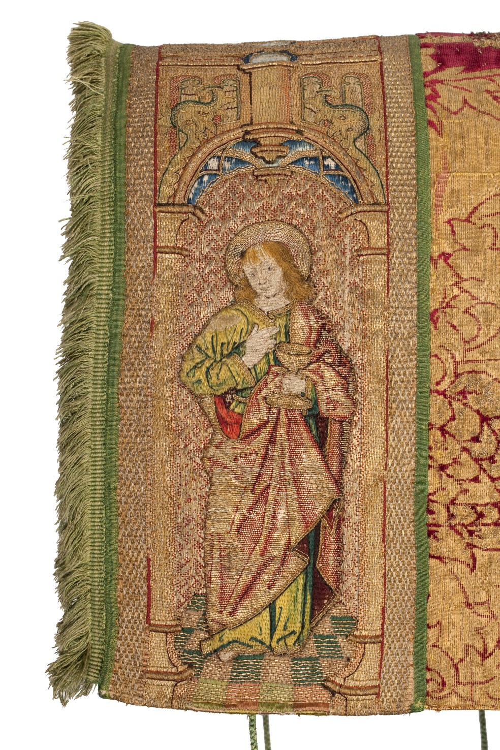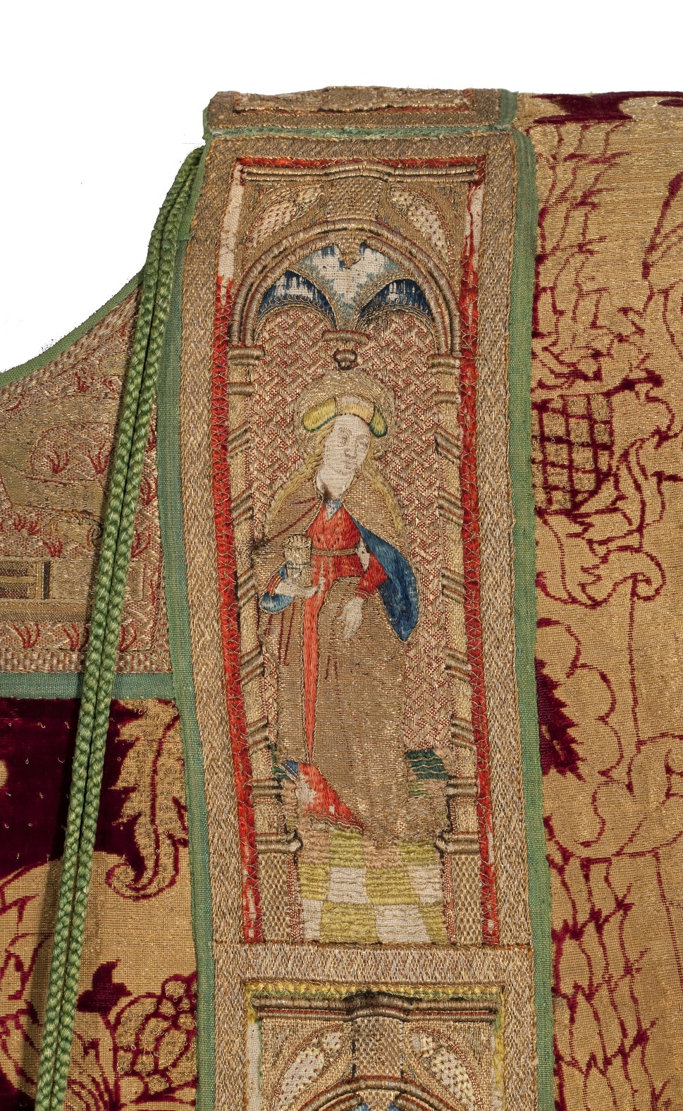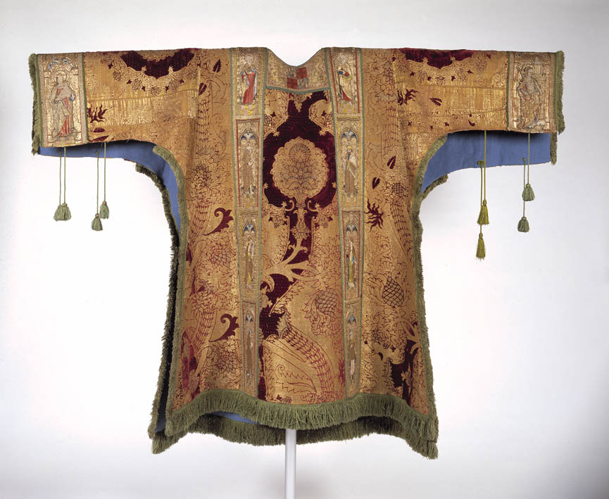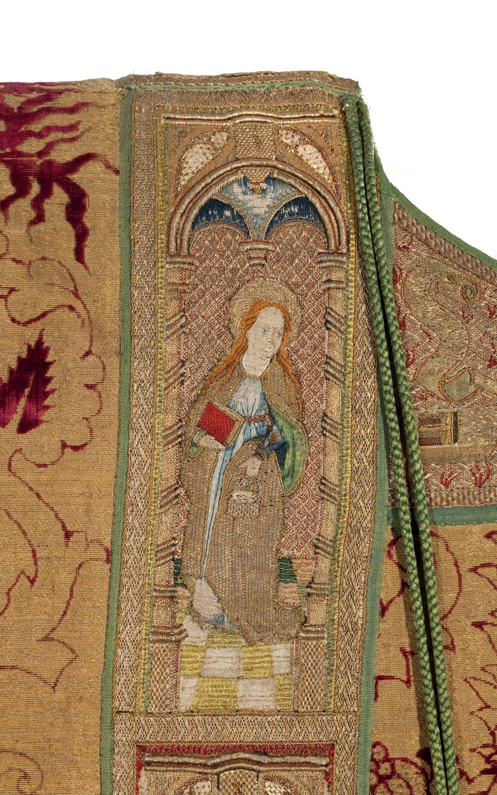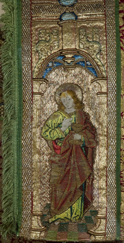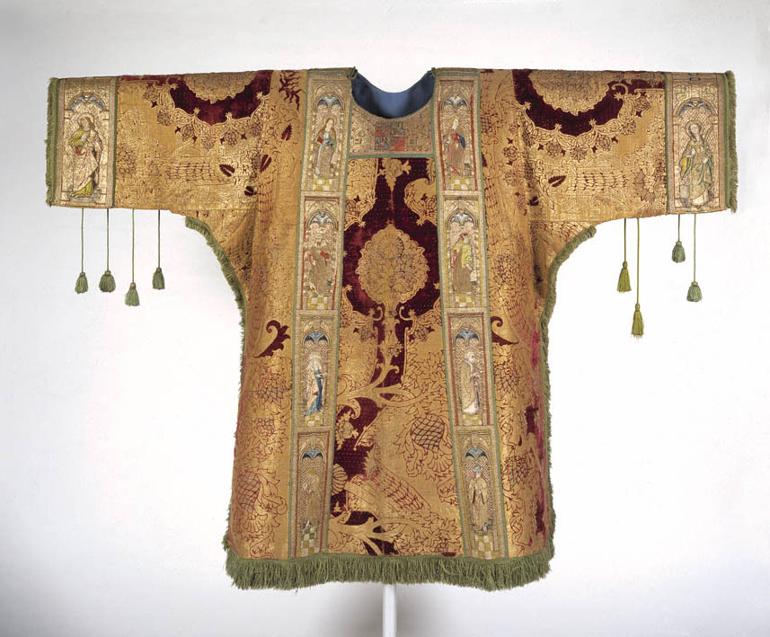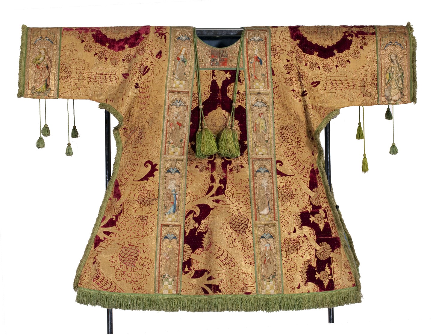 Rode dalmatiek met granaatappel en distelmotief en o.a. Barbara en Maria met kind op mouwen