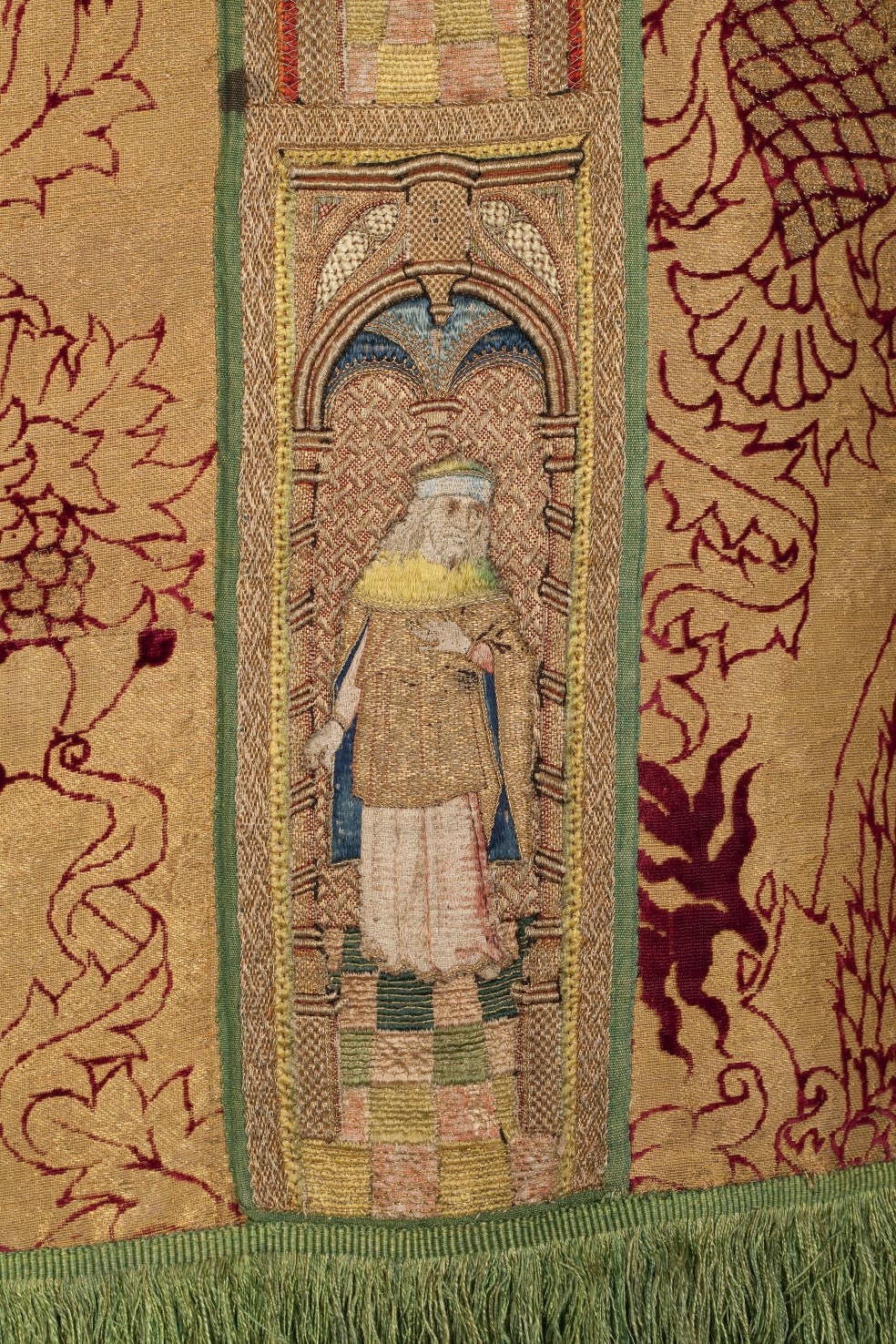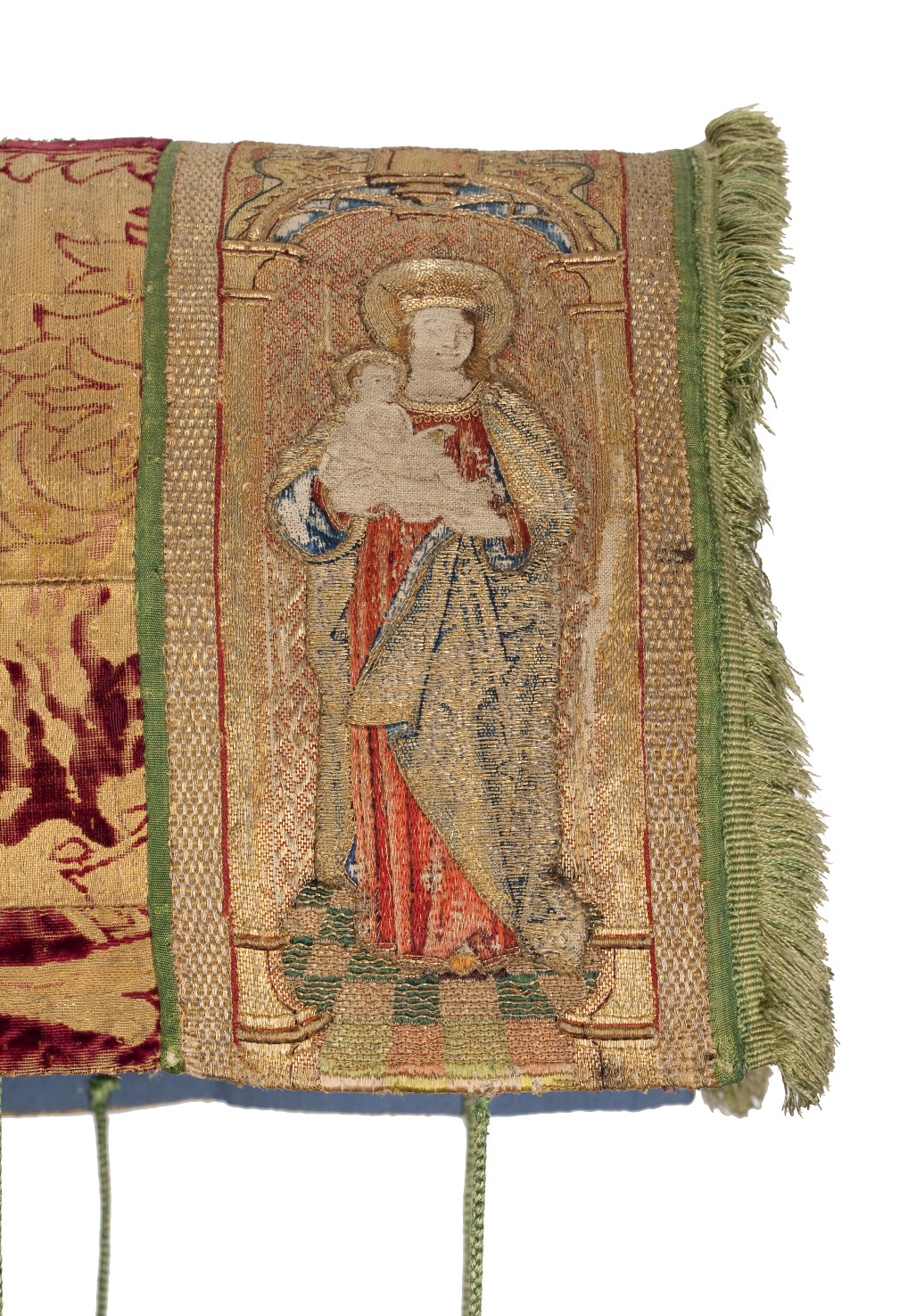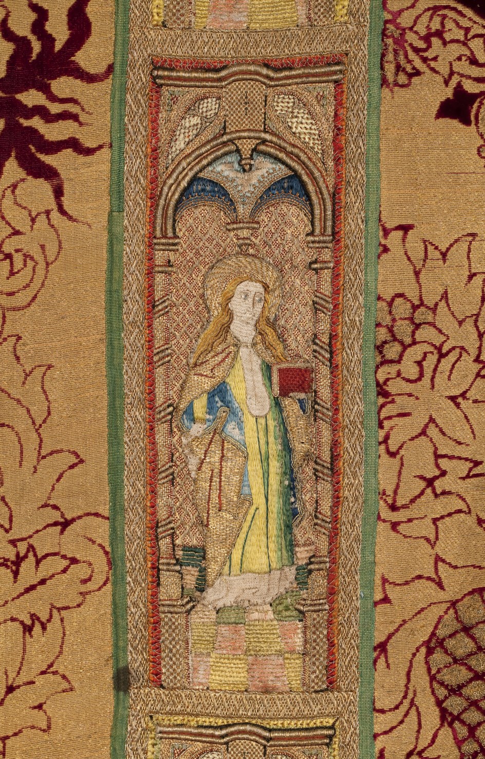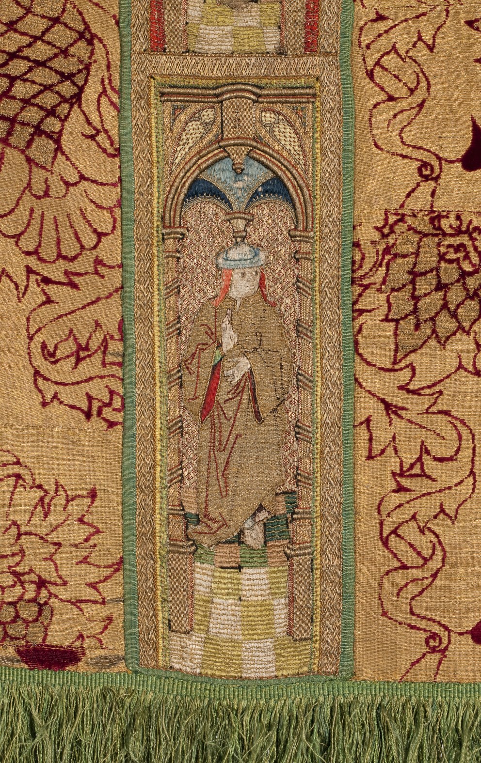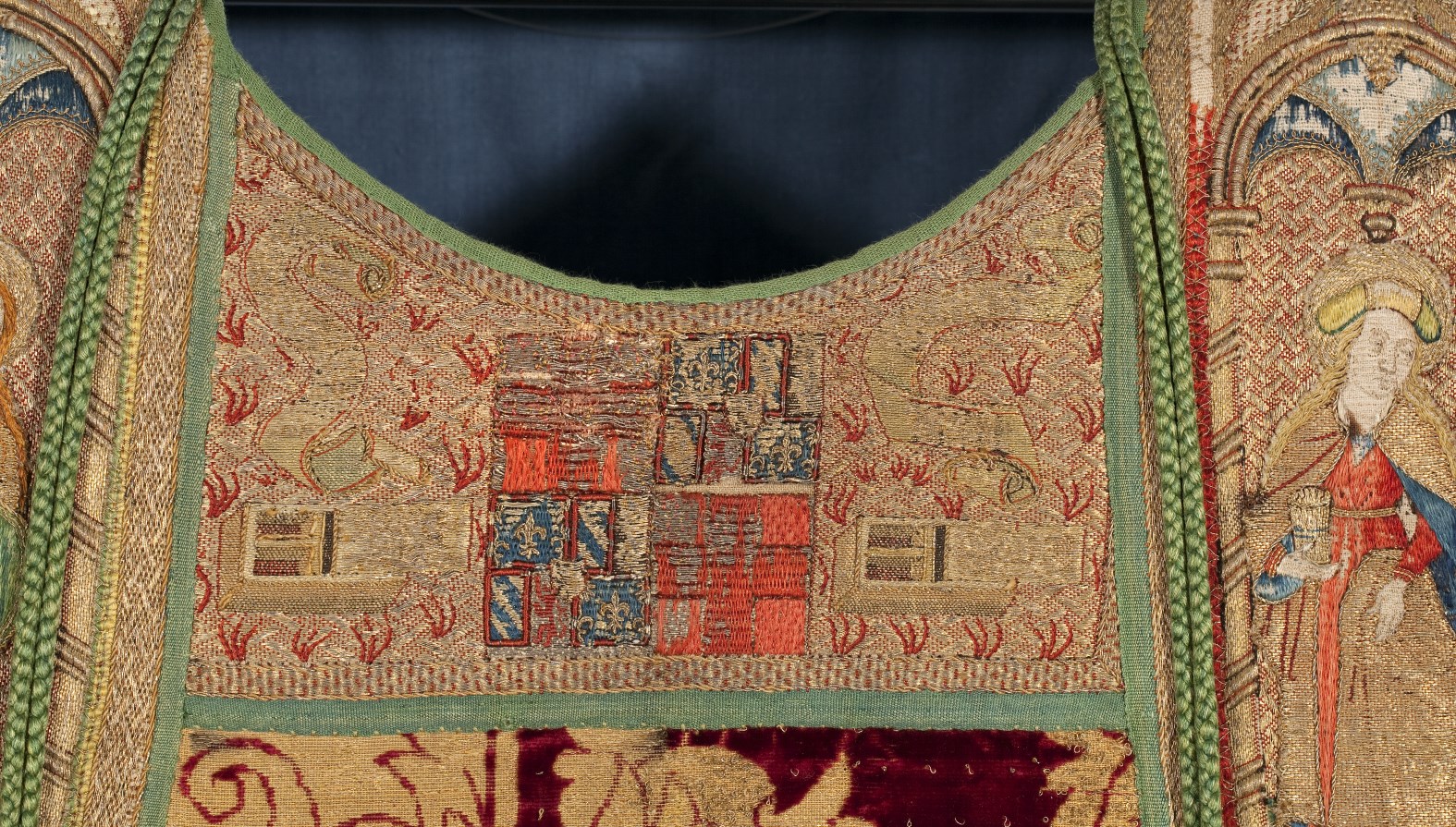 Rode dalmatiek met granaatappel en distelmotief en o.a. Barbara en Maria met kind op mouwen
