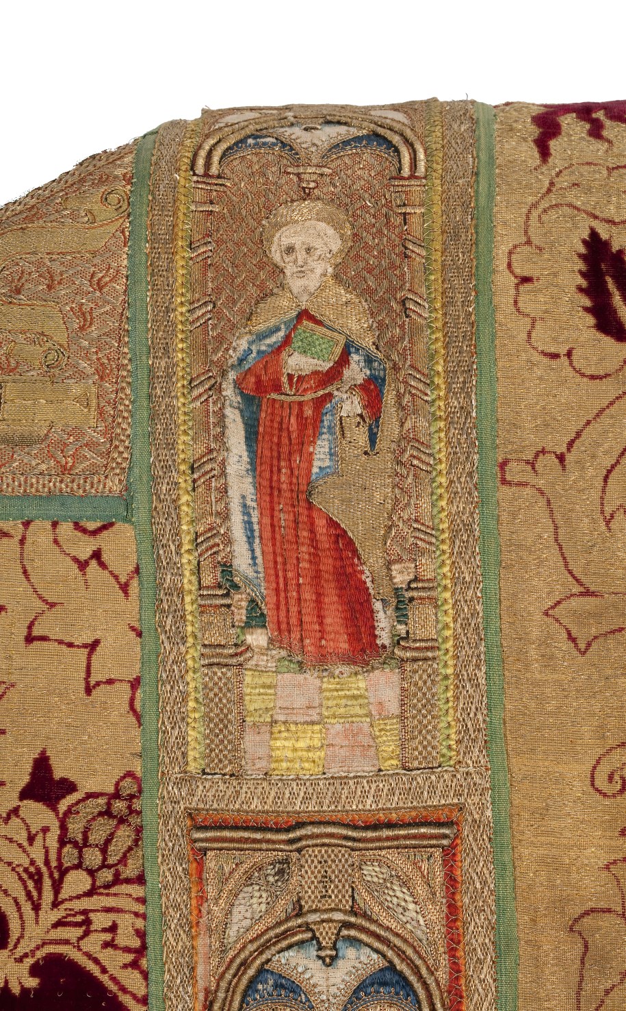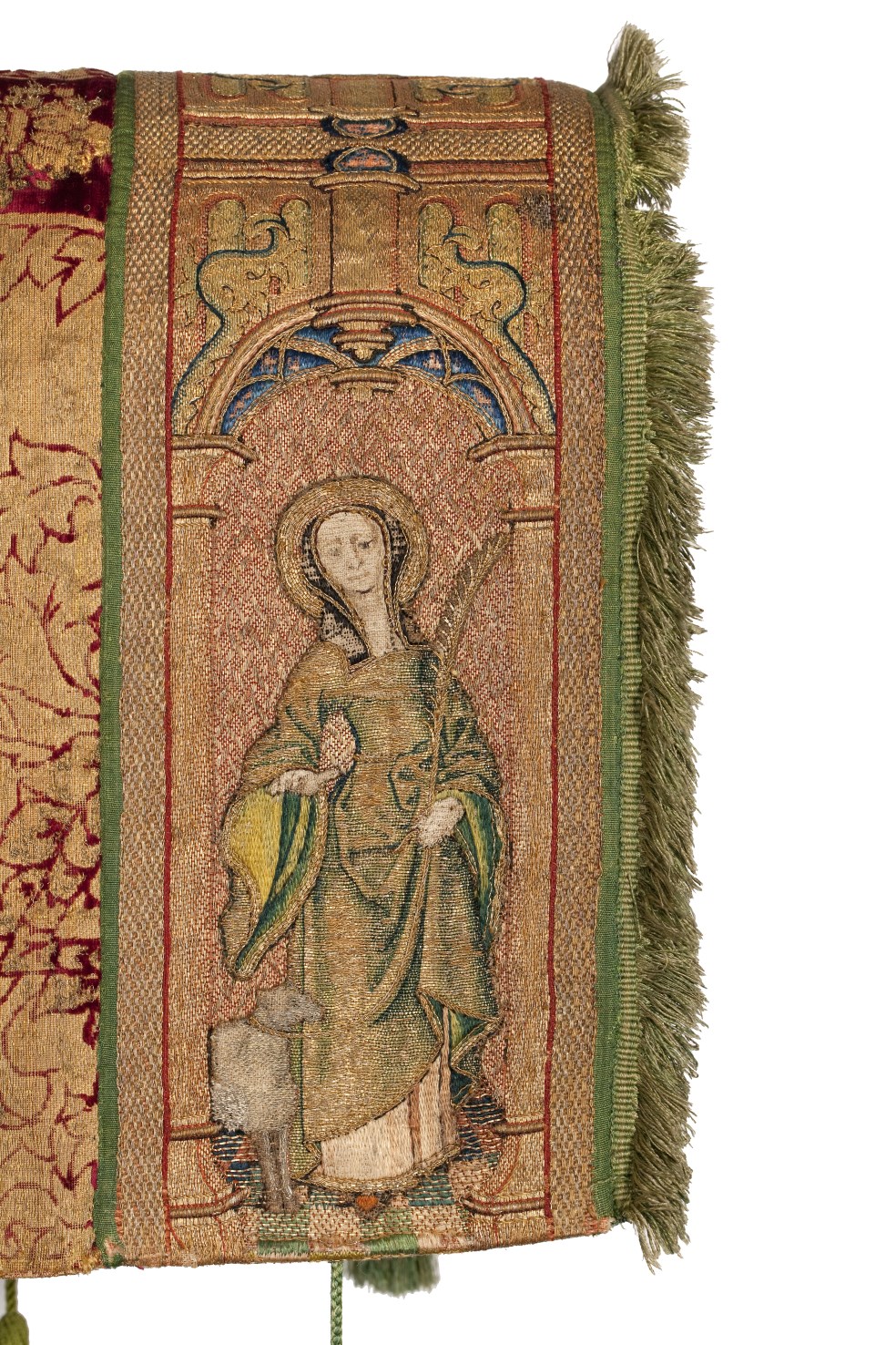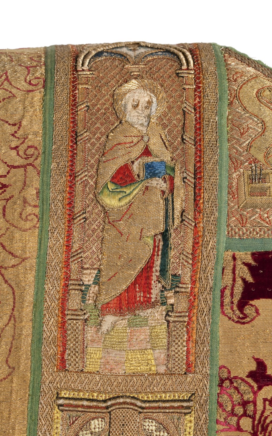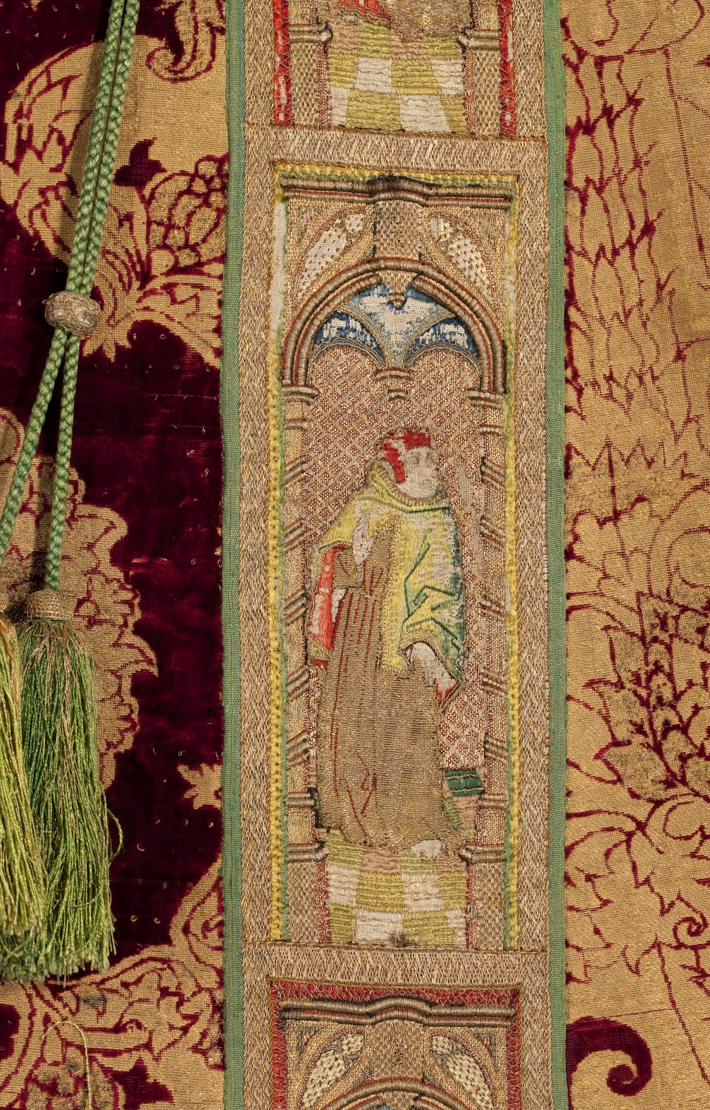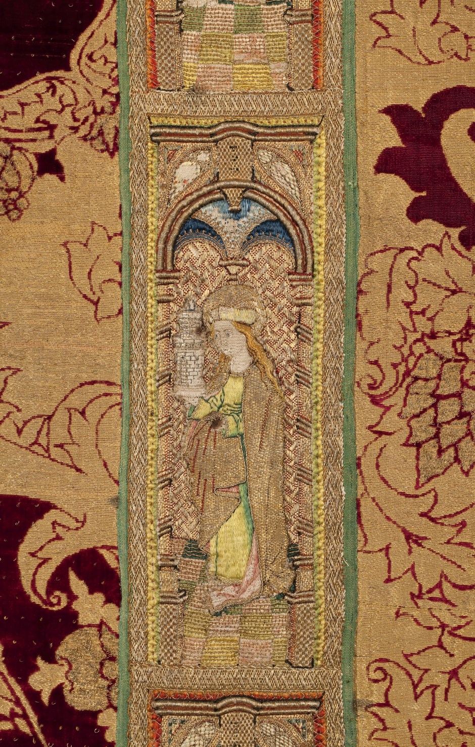 Rode dalmatiek met granaatappel en distelmotief en o.a. Barbara en Maria met kind op mouwen
