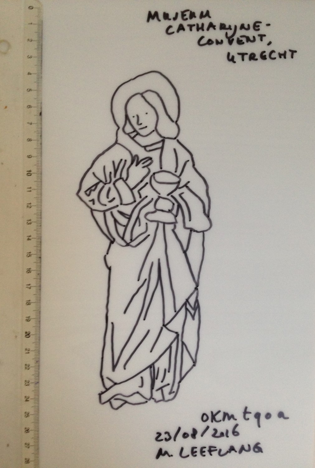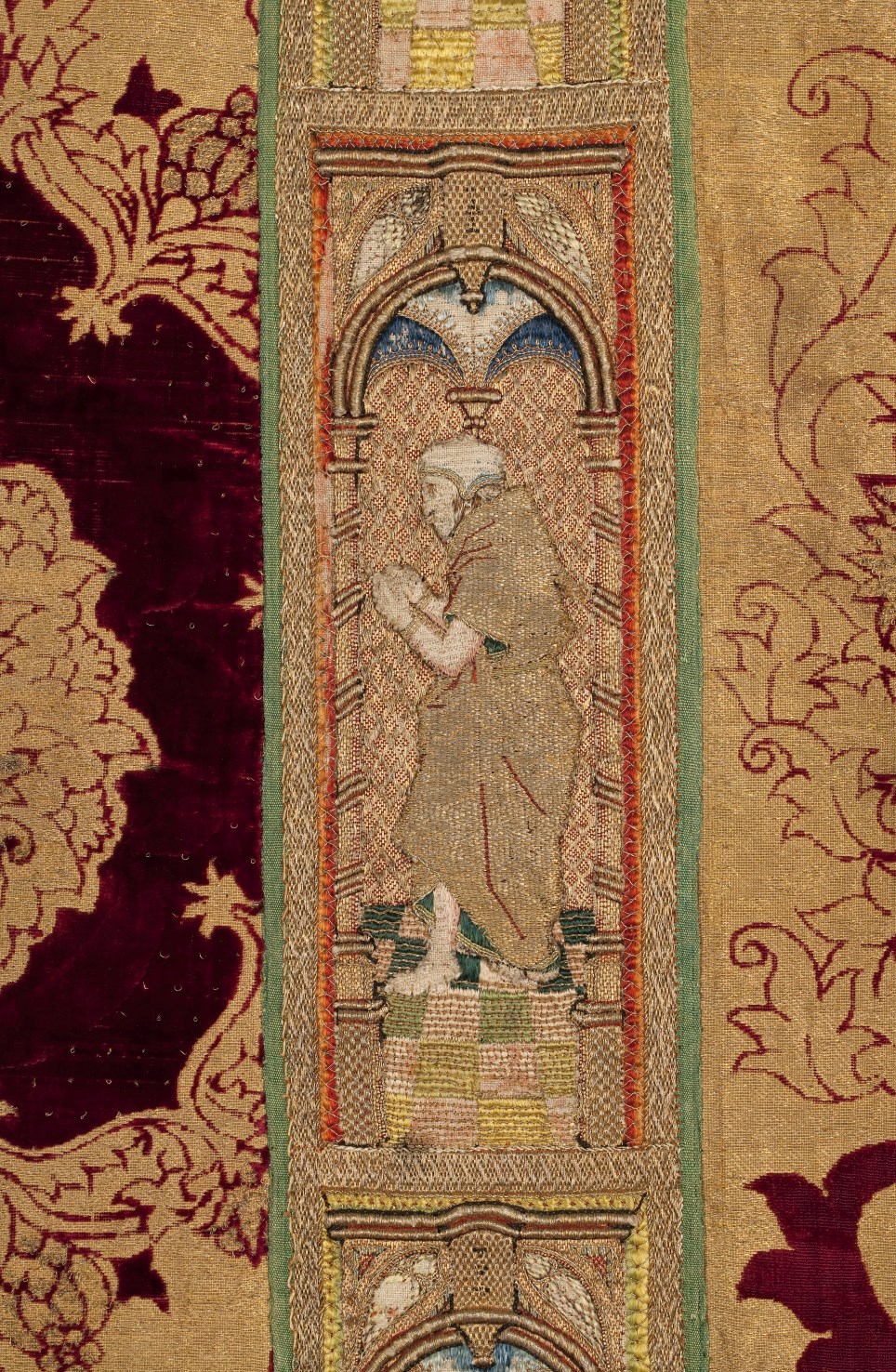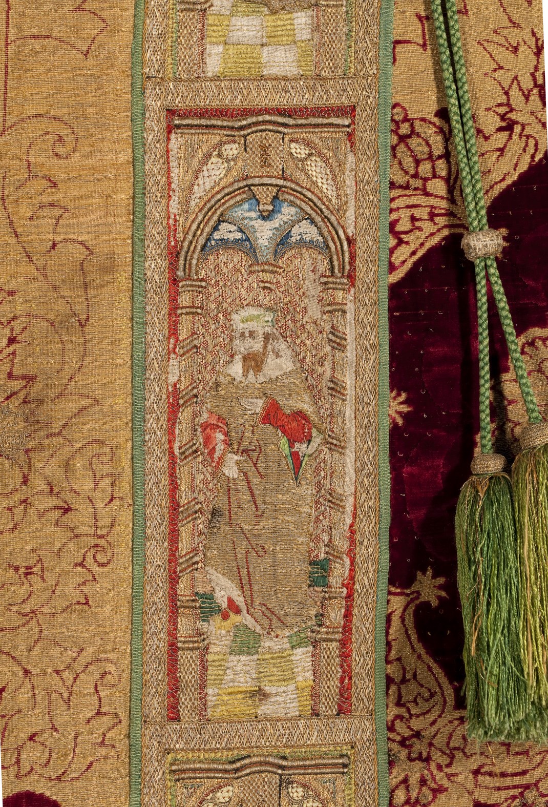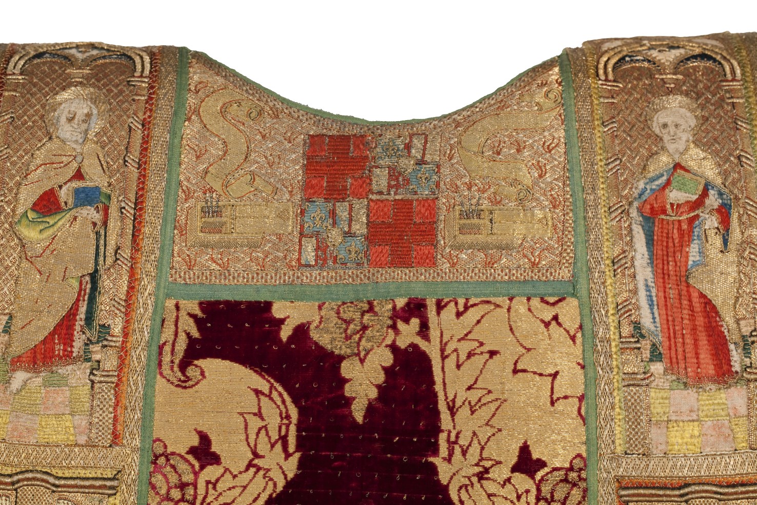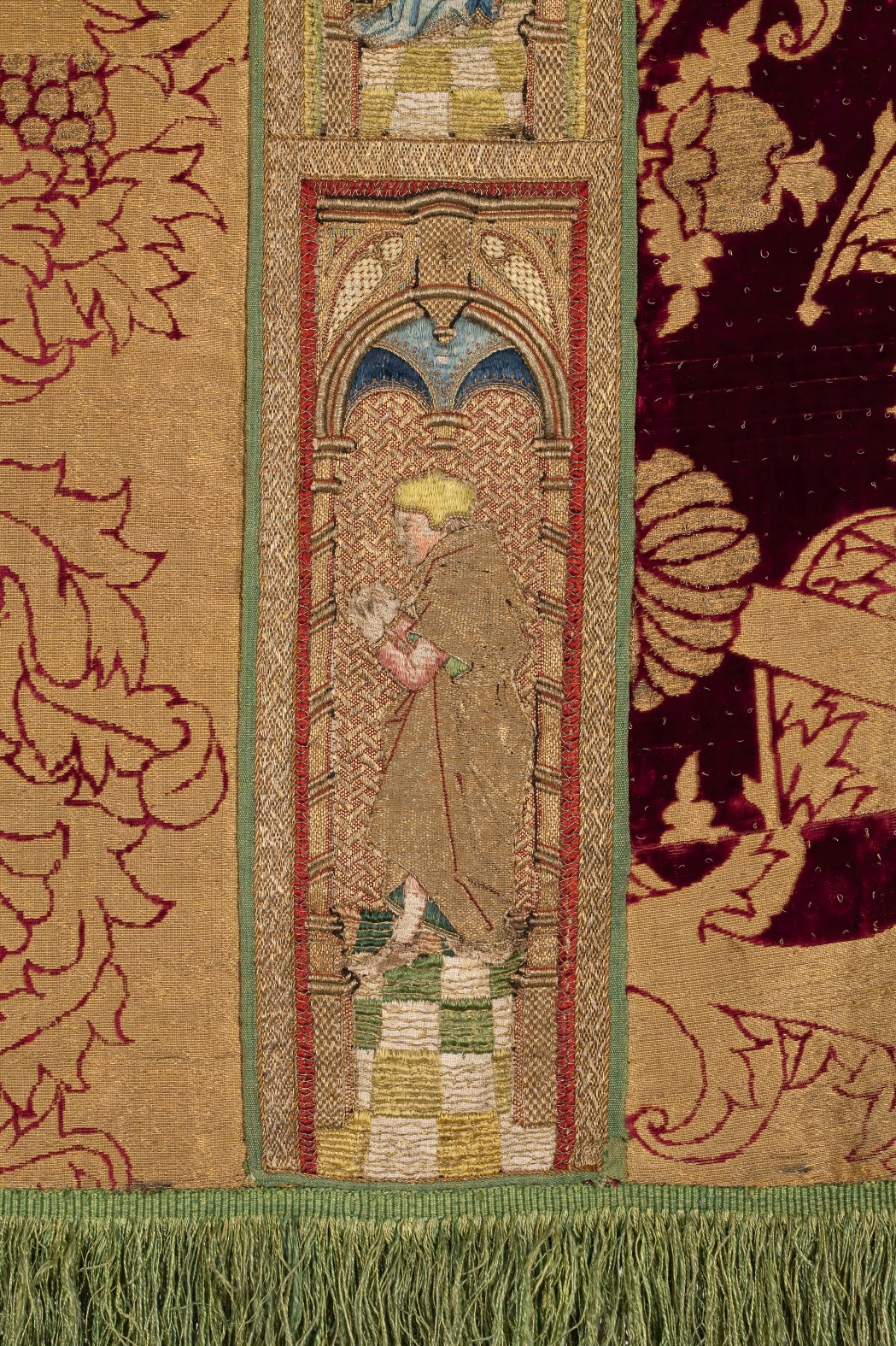 Rode dalmatiek met granaatappel en distelmotief en o.a. Barbara en Maria met kind op mouwen