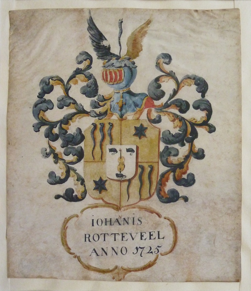 Wapenschild met twee maal drie slangen en een ster en met viool, met "Ioanis Rotteveel anno 1725"