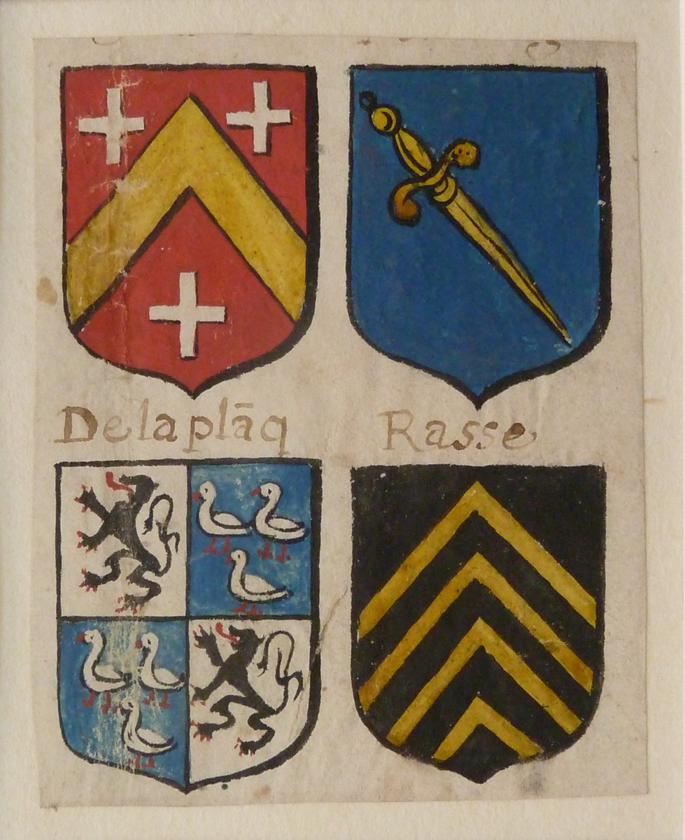 Vier wapenschilden, een met zwanen en leeuwen waarboven "Delaplaq" en een met visgraatmotief