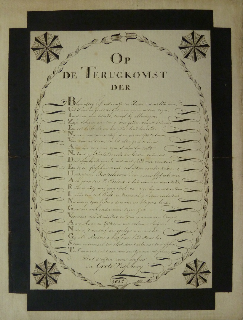 Kalligrafie met twee acrostichons over uitzeilen en thuiskomst van de buizen op haringvangst