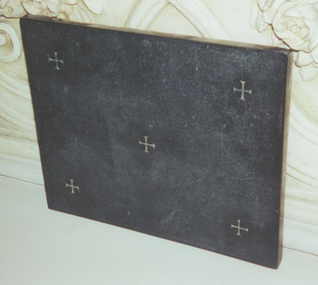 Altaarsteen van zwart marmer, met vijf gegraveerde kruisjes