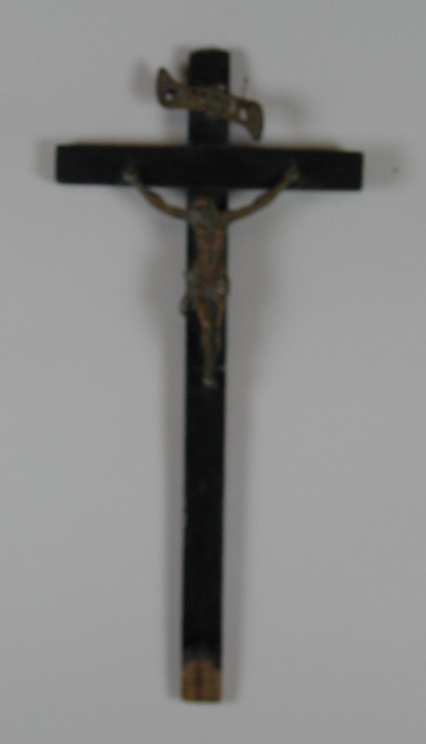 Crucifix van zwart geverfd hout met koperen corpus en INRI