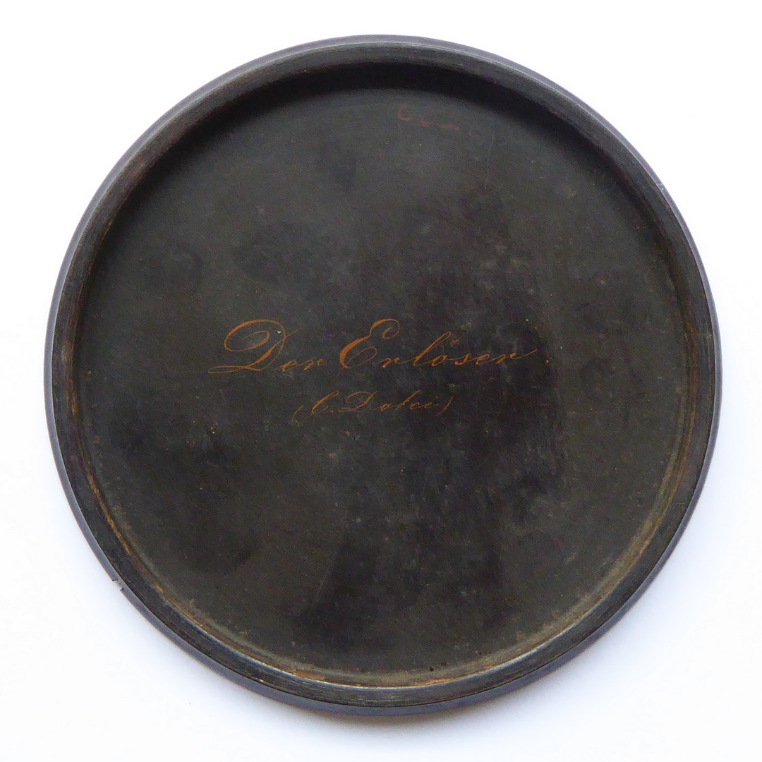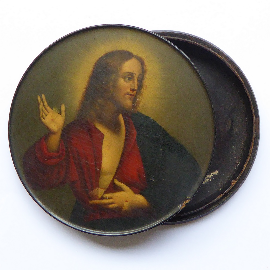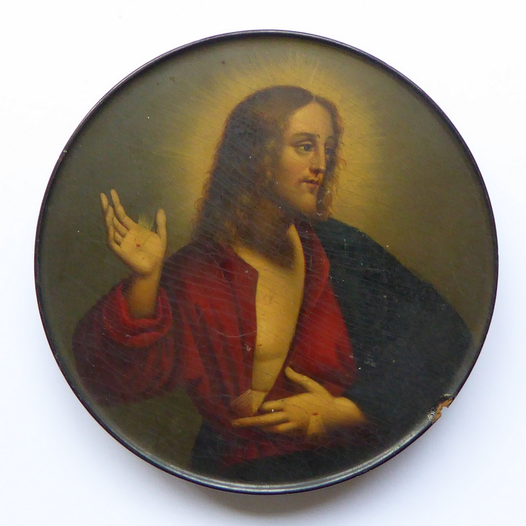 Zwart doosje met op deksel schildering van Christus die stigmata toont