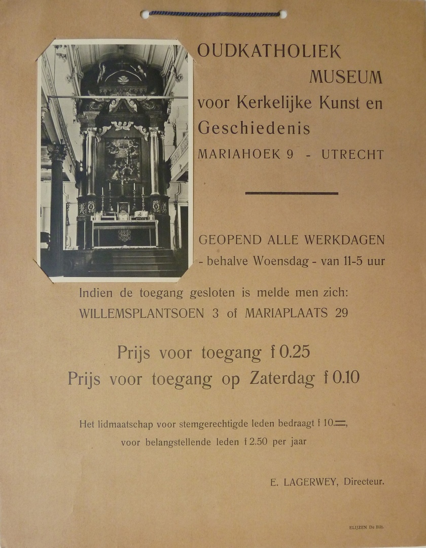 Affiche met openingstijden van het Oud-Katholiek Museum, met altaar schuilkerk Gertrudiskapel