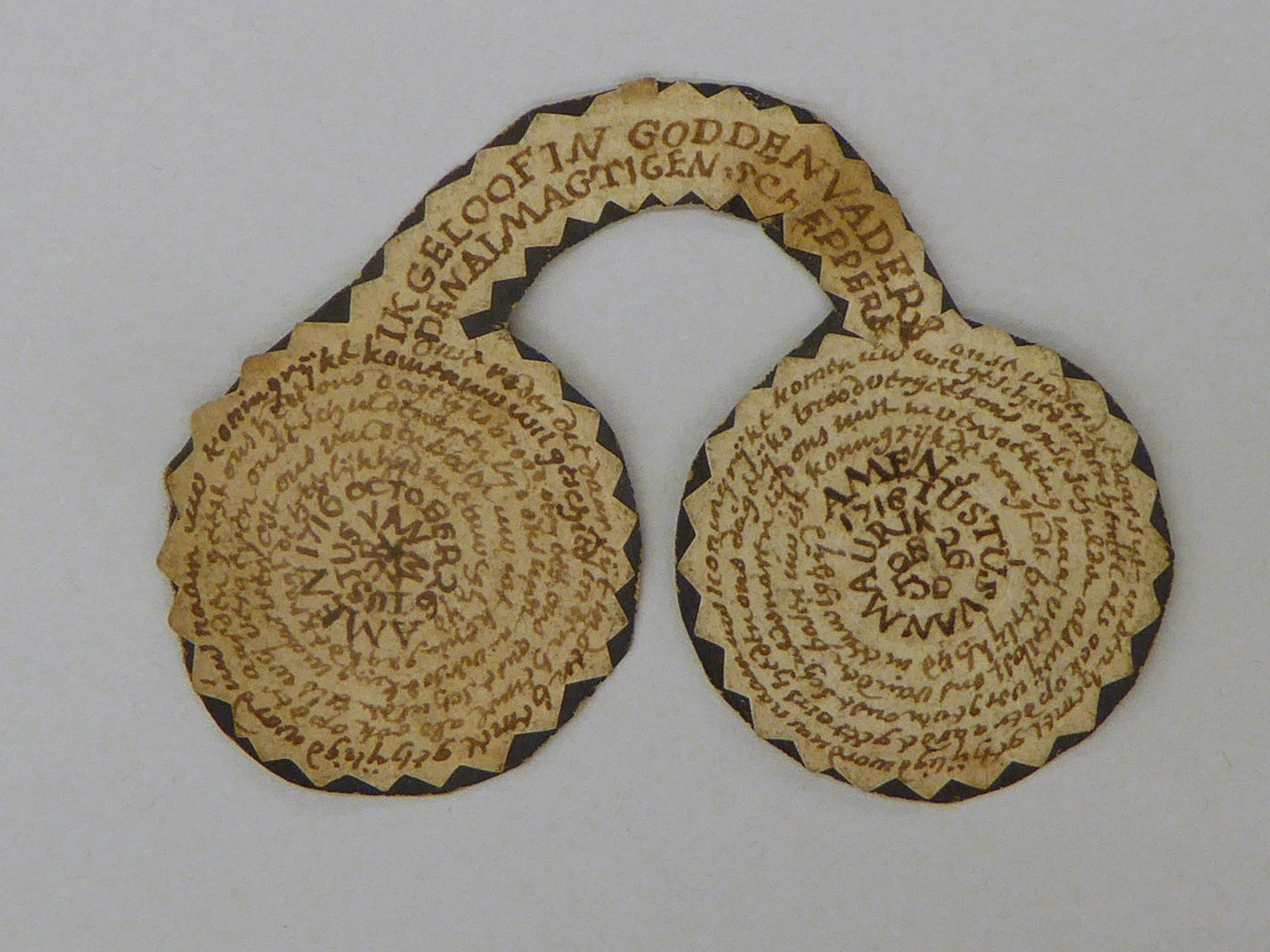 Handschrift in vorm van knijpbril met twee maal het Onze Vader en "Iustus van Maurik ... 1716"